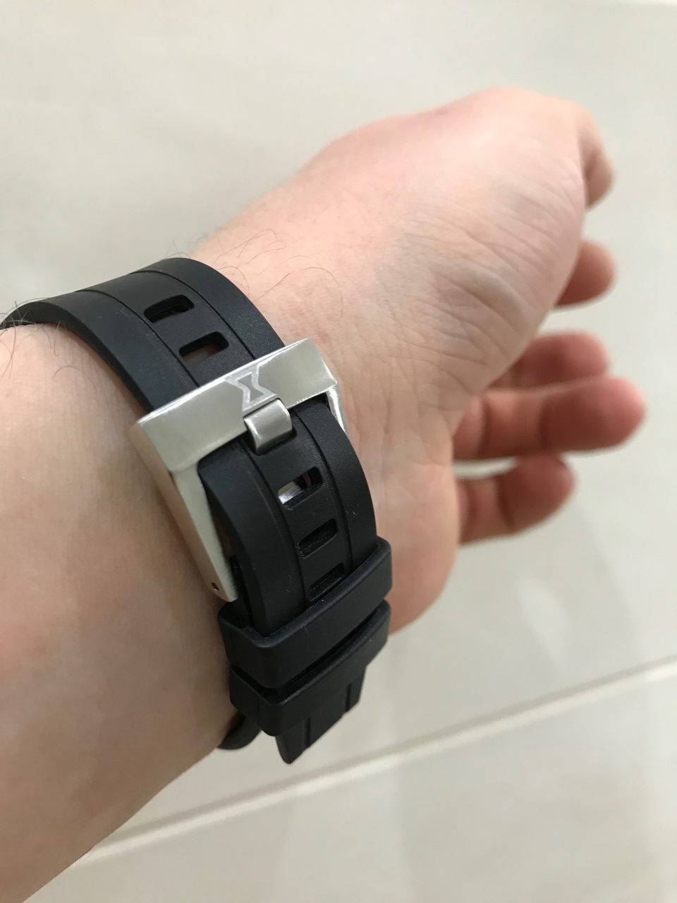 Фоток на руке с браслетом не сделал, и уже повесил каучук. Поэтому фото только с каучуком.
