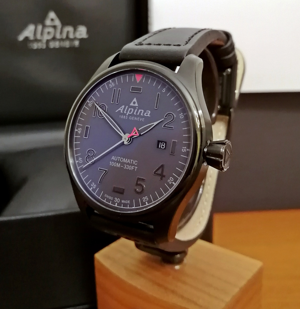 В продаже шикарные мужские механические часы Alpina Startimer Pilot в 44 миллиметровом размере корпуса на чёрном кожаном ремешке.