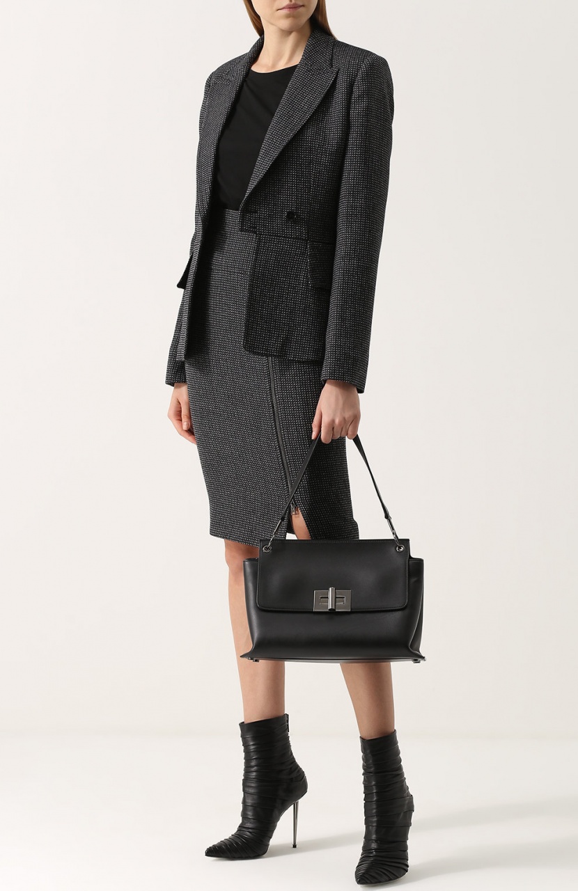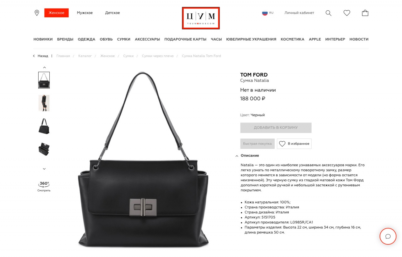 "Коллекция Natalia - одна из наиболее узнаваемых линеек женских сумок и аксессуаров Tom Ford. Сумки и клатчи этой культовой для бренда линейки легко узнать по характерному элементу - крупному прямоугольному металлическому поворотному замку, размер которого меняется в зависимости от модели, но форма остается неизменной. В данной версии модели черную сумку из гладкой матовой кожи Том Форд дополнил короткой ручкой и фурнитурой с рутениевым покрытием."