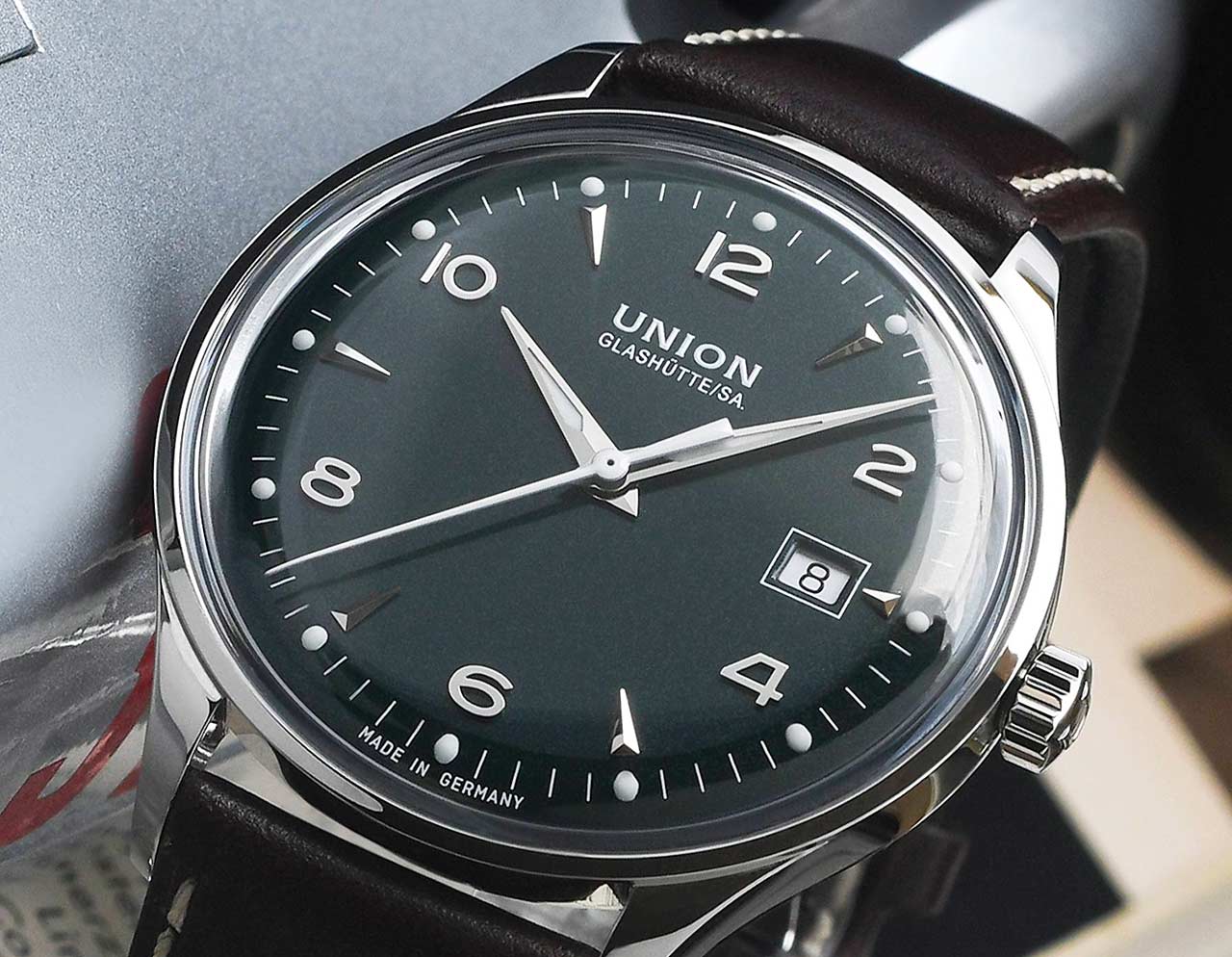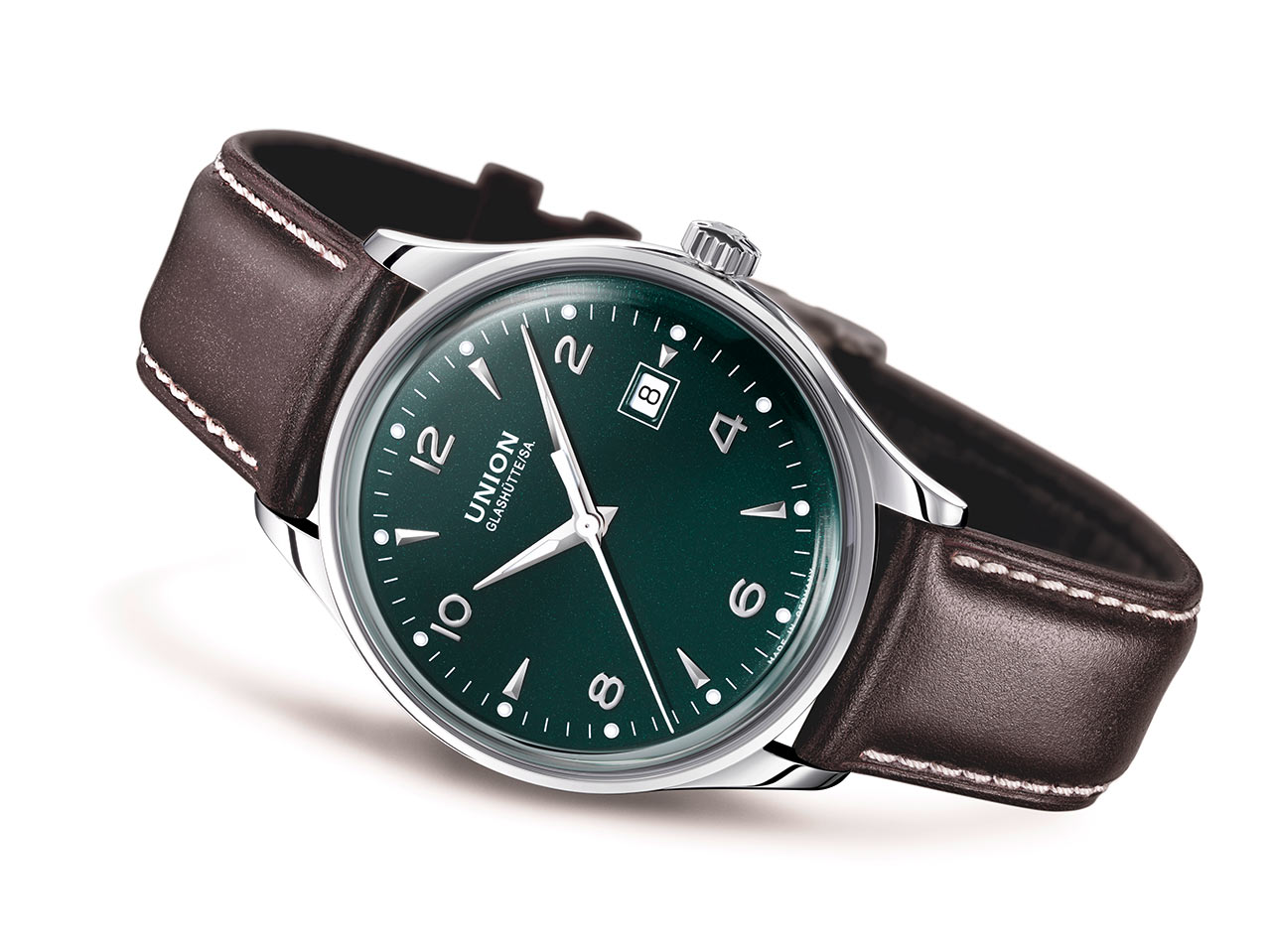 Дизайн новой модели Noramis Date (Ref. D012.407.16.097.00) от немецкой часовой компании Union Glashütte, благодаря циферблату British Racing Green и ремешку из мягкой британской кожи, вызывает ассоциации с классическими английскими гоночными автомобилями. Круглый полированный корпус новинки, изготовленный из нержавеющей стали, диаметром 40,00 мм, толщиной 9,85 мм, водонепроницаемый до 100 метров. На торце завинчивающейся рифленой заводной головки, расположенной на 3 часах, выгравировано изображение бренда Union Glashütte. Сапфировое стекло установлено на передней стороне часового корпуса (выпуклое) и на его завинчивающейся задней крышке. Темно-зеленый циферблат имеет металлическое мерцание, полученное благодаря использованию крошечных металлических частиц в лаке. Накладные арабские цифры и конические граненые часовые индексы. Люминесцентное покрытие SuperLumiNova белого цвета на конических часовой и минутной стрелках и на точечных часовых маркерах.