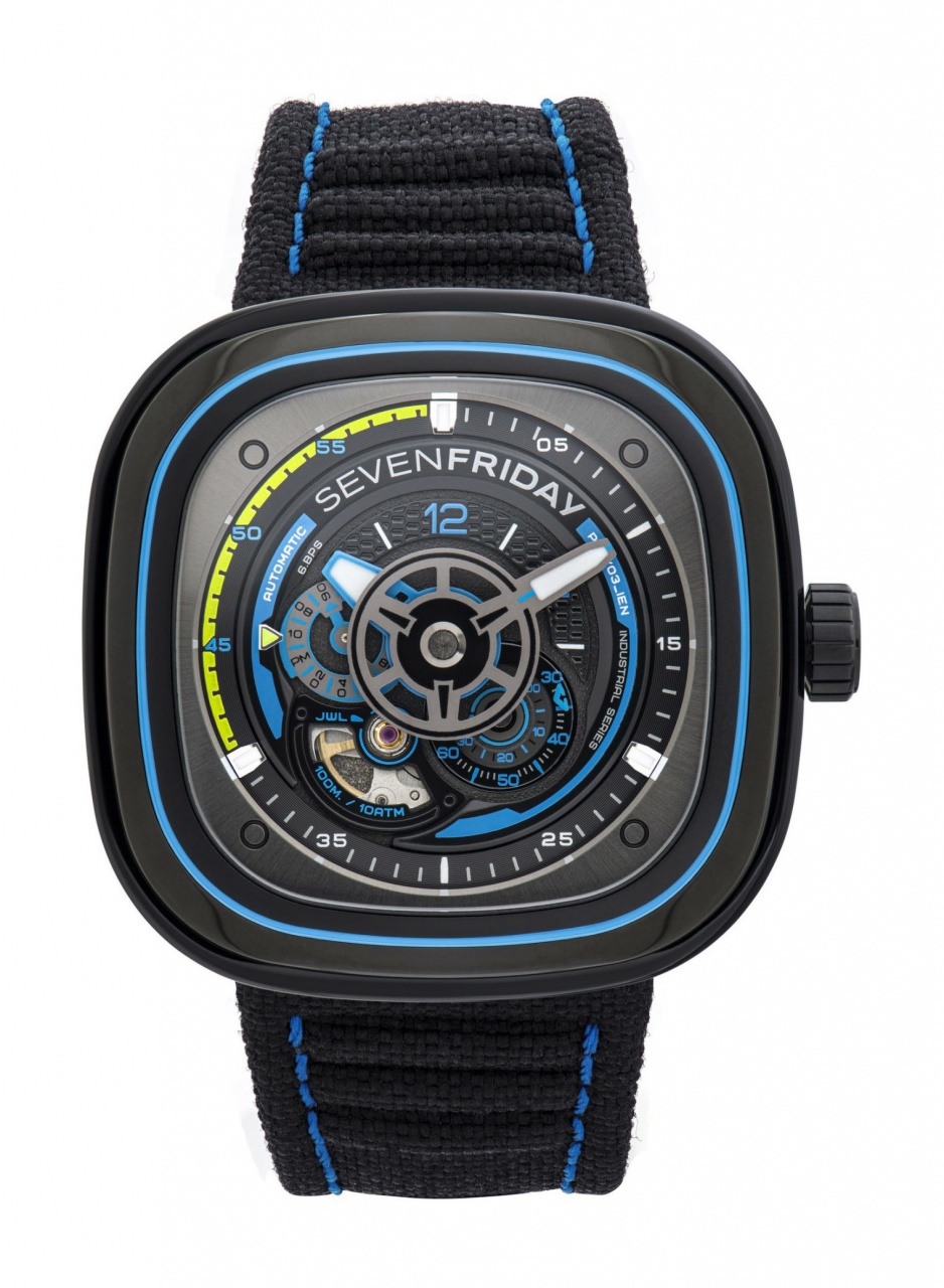 Новая модель P3C/03 BEACH CLUB от швейцарской часовой компании SevenFriday имеет часовой корпус подушкообразной формы, изготовленный из нержавеющей стали с черным PVD-покрытием, размером 47,6 х 47,0 мм, водонепроницаемый до 100 метров. На фиксированном безеле имеется канавка с синей краской Berlac. На торце завинчивающейся рифленой заводной головки, расположенной на 3 часах, выгравировано изображение логотипа бренда SevenFriday. Задняя крышка часового корпуса, также изготовленная из нержавеющей стали, глухая завинчивающаяся, с встроенным с чипом SevenFriday NFC, позволяющим осуществлять аутентификацию и регистрацию часов с помощью приложения SevenFriday. Циферблат черного цвета, сложный многоуровневый, с белым люминесцентным покрытием на часовой и минутной стрелках.
