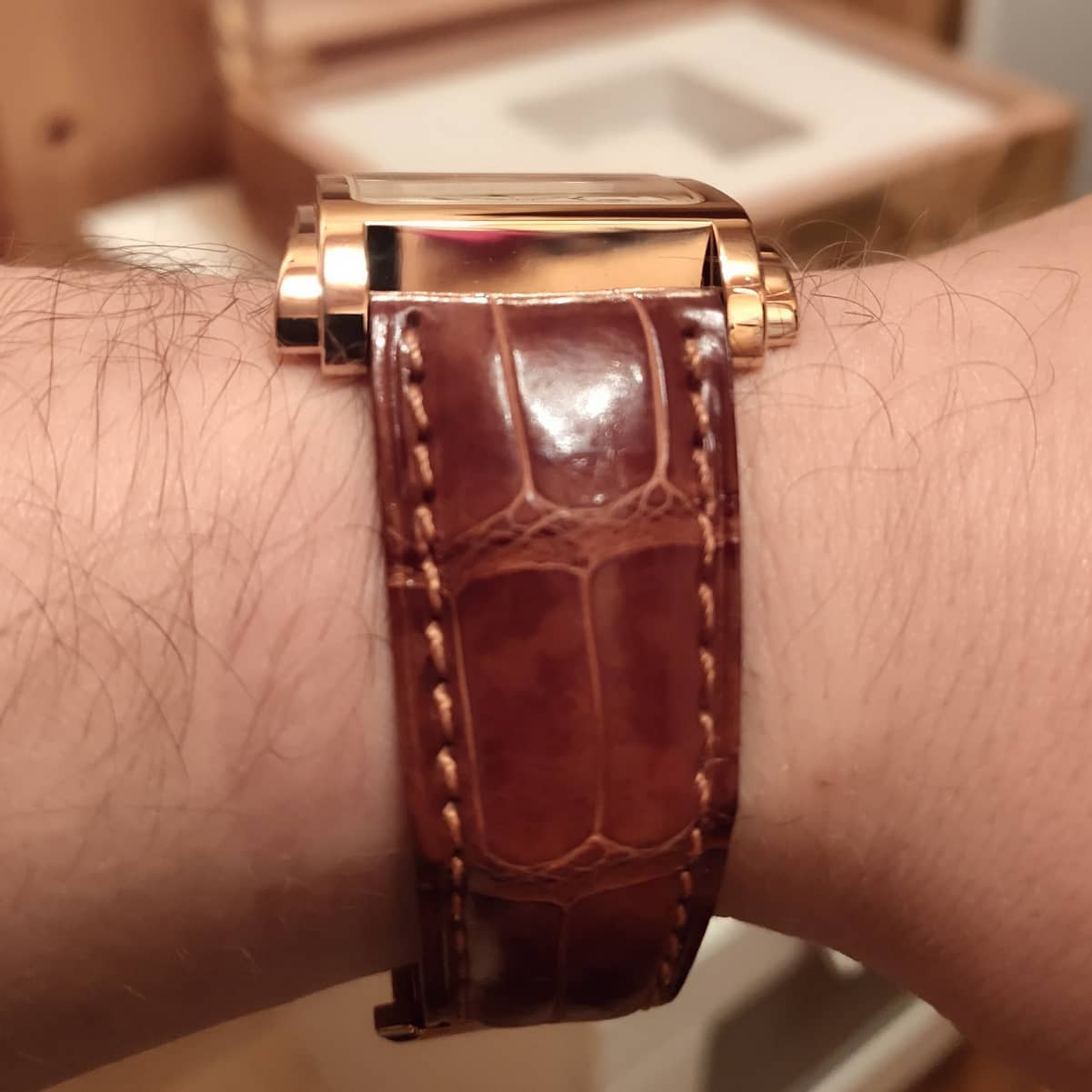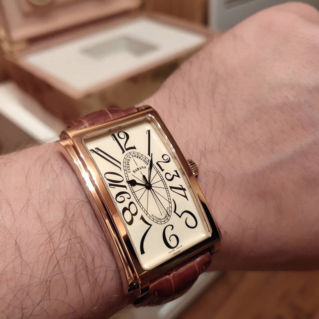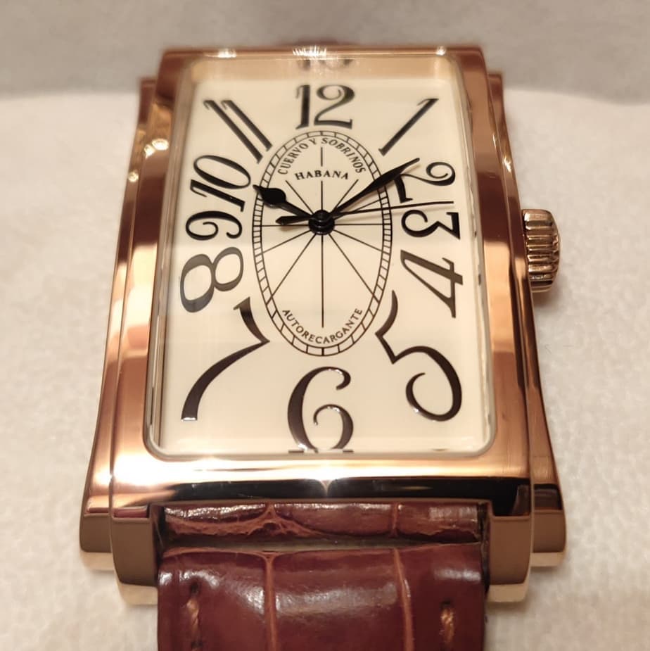 Потрясающе красивые и очень претижные золотые швейцарские часы Cuervo y Sobrinos Prominente в крупном корпусе из золота 750 пробы размером 33x52мм на шикарном коричневом ремне из луизианского аллигатора с фирменной золотой застежкой. Часы идеально сидят на любом запястье благодаря продуманной эргономике и изогнутому корпусу, а прямоугольный дизайн с изумительными цифрами на циферблате делает эти часы поистине не подвластными времени. Механика с автоподзаводом и функциями часов, минут и большой секундной стрелки. Очень красивый эмалевый циферблат бежевого цвета с филлигранно нарисованными черными арабскими цифрами. Отдельное слово надо сказать про шкатулку для этих часов, поскольку это еще и настоящий хюмидор для сигар, так как название модели Prominente - это один из элитных сортов сигар. Огромная шкатулка выполнена из ценных пород массива тропического кедра из семейства мелианковых — единственного, помимо самого табака, материала, тонкий аромат которого обогащает запах сигары. Открывая шкатулку, вы словно окунаетесь в мир благородного аромата кедрового леса. Петли на крышке и все металлические части внутри шкатулки позолочены. Идеальное внешнее и техническое состояние часов и футляра. Общий вес часов 110 грамм. Ритейл этой модели 19000$ Рассмотрю обмен на швейцарские часы с вашей или моей доплатой. В приоритете Dubey&Schaldenbrand.