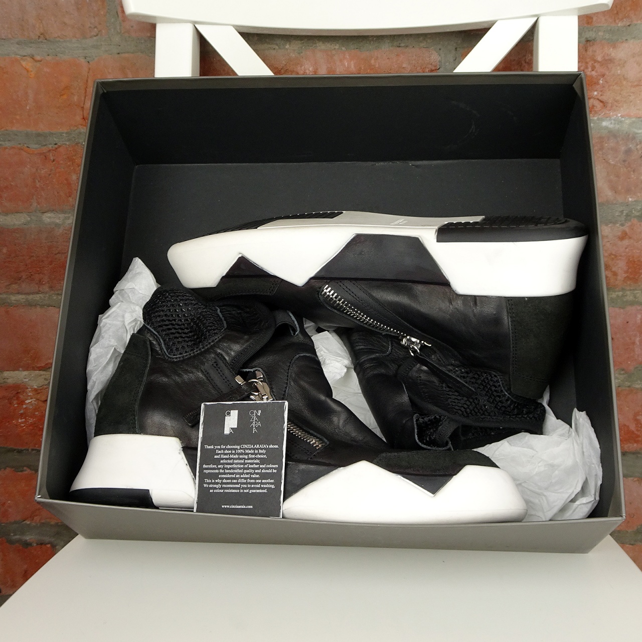 Cinzia Araia (Чинция Арайя) - марка, созданная в Венеции в 2010 году. На сегодняшний день выпускает признанную во всем мире ультрамодную современную обувь. Четкие линии, оригинальный крой и превосходное качество исполнения в лучших мастерских северной Италии - отличительные черты обуви Cinzia Araia.