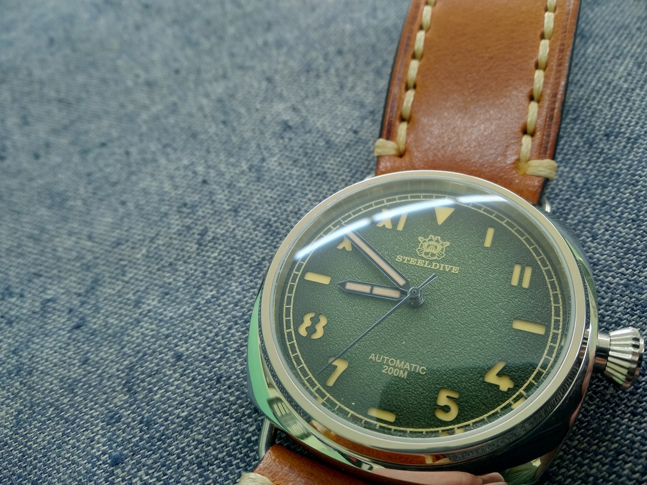 Циферблат - приятного зеленого цвета, фактурный, и выполнен в виде сендвича. Смотрится классно. Люминофор на стрелках и метках - мое почтение, светит ярко, а главное долго.