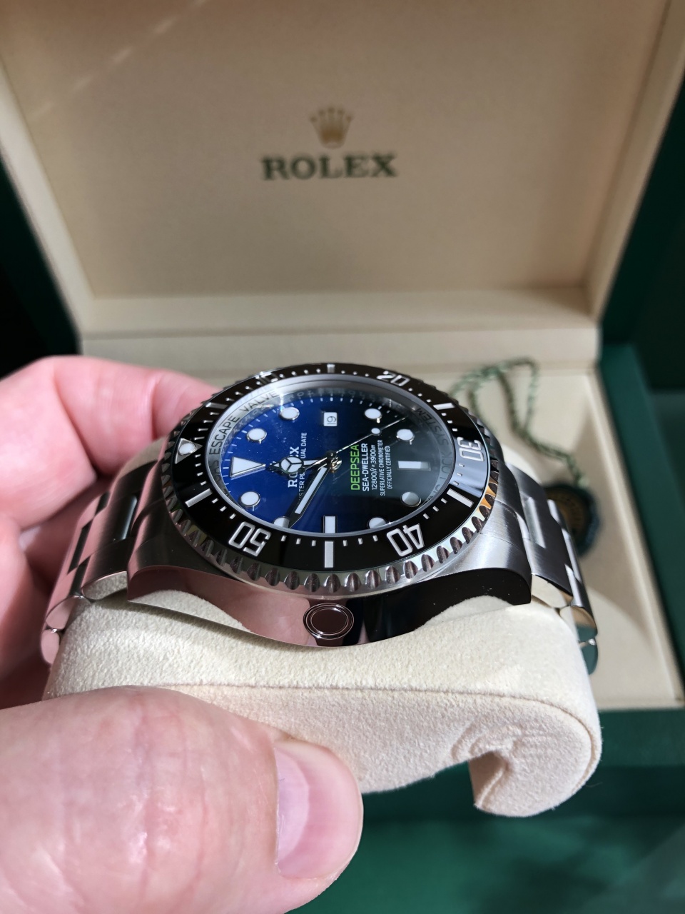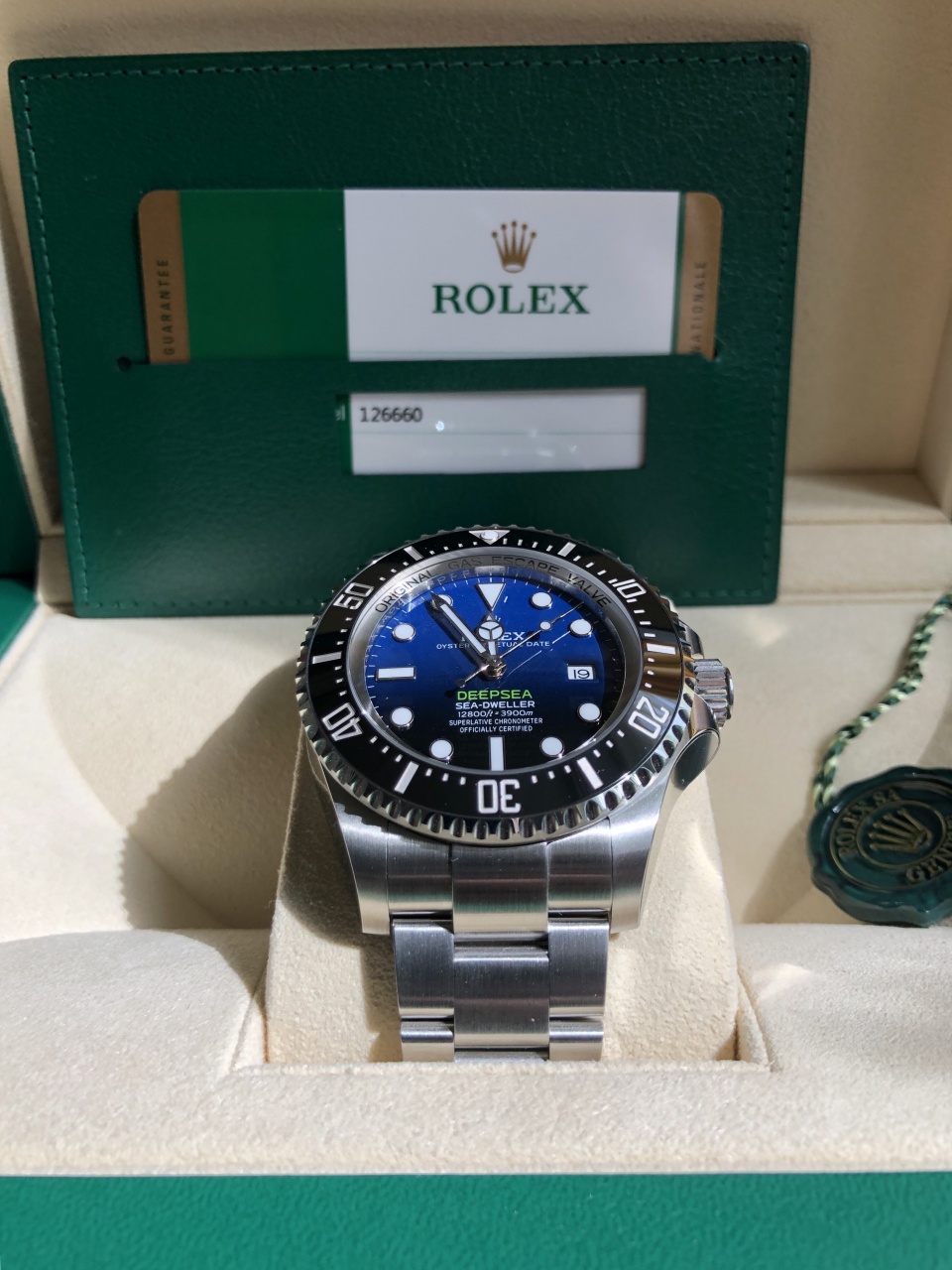 Новая версия знаменитой модели часов Rolex Sea-Dweller Deepsea! Референс данной модели Ролекс 126660. Часы выполнены из нержавеющей стали, цвет циферблата переходит из темно-синего в ярко-насыщенный черный. Данный циферблат был выпущен в 2014 году для специальной памятной версии в честь экспедиции Deepsea Challenge, организованной при поддержке Rolex и Национального географического общества. В ходе этой экспедиции кинорежиссер и исследователь Джеймс Кэмерон достиг самой глубокой точки Мирового океана – дна Марианской впадины, глубина которой составляет 10 908 метров.