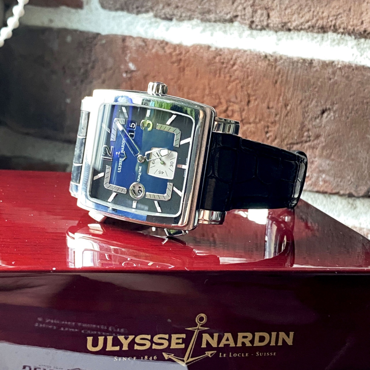 Шикарные часы в солидном черно-синем циферблате! У этих часов с крупными серебристыми часовыми метками находятся: дополнительный секундный циферблат, двойное окошечко даты и круглое окошко с указанной в нем временной зоной. Корпус нержавеющей стали, 42 х 42 мм. Циферблат черный с синим. Запас хода около 42 часов. Водонепроницаемость 50 метров. Стекло - сапфир. Кожаный браслет с откидывающейся застежкой.