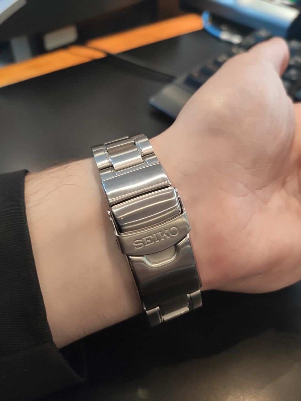 Присутствуют слегка заметные следы носки. Крупных царапин на корпусе нет. На стекле вообще нет. Комплект: часы, документы, коробка, 2 НАТО ремня, оригинальный браслет, ремешок из канваса (seiko, от другой модели), кожаный ремешок stailer (на фото). Дата производства часов: Май 2019.