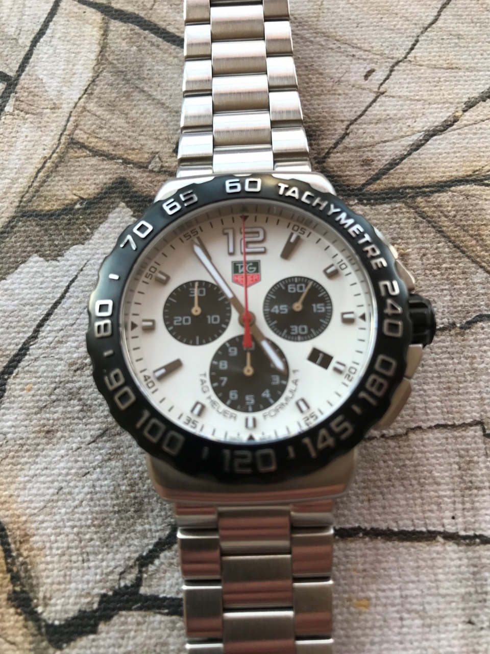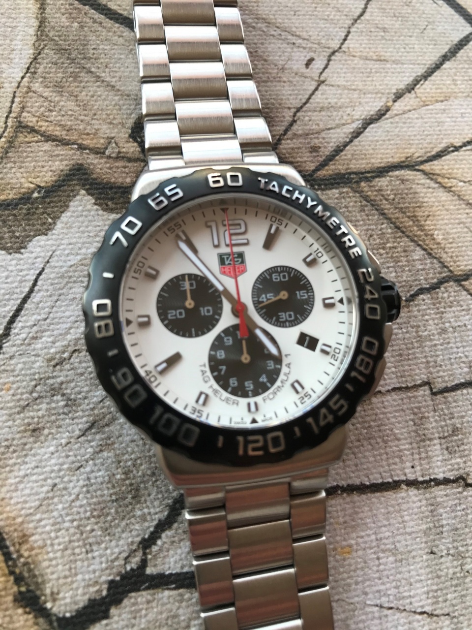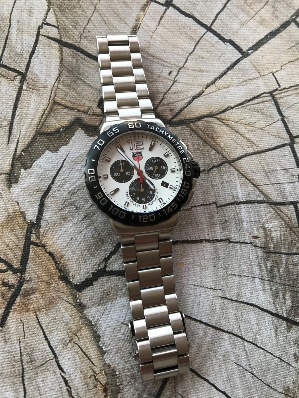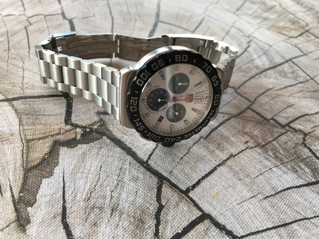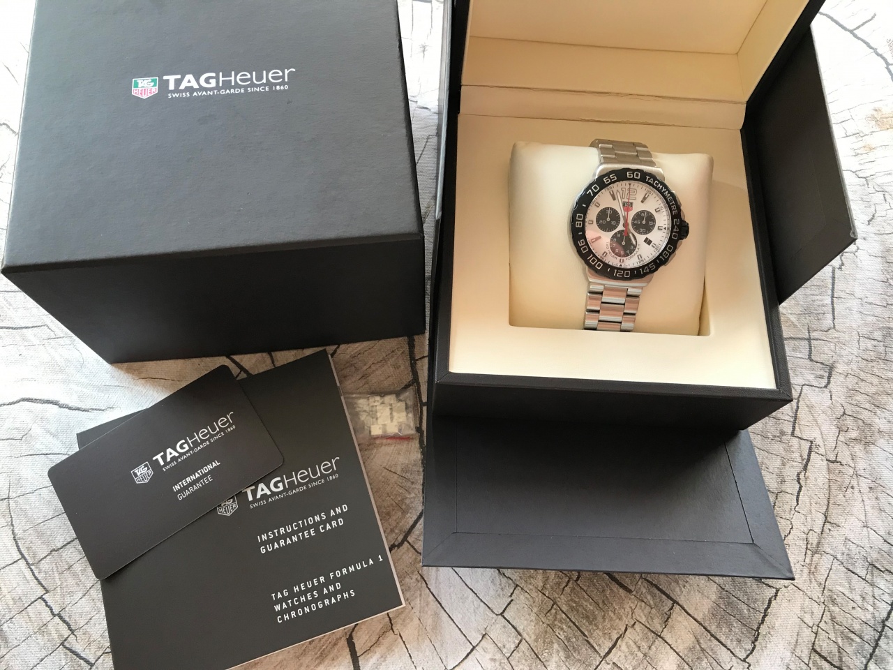 В наличии практичный хронограф TAG Heuer F1 CAU1111.BA0858 в отличном состоянии! Часы куплены в бутике "Тайм Авеню". Полный комплект: часы, внешняя коробка, шкатулка, инструкция, гарантийная карта, бирки, доп. звенья.