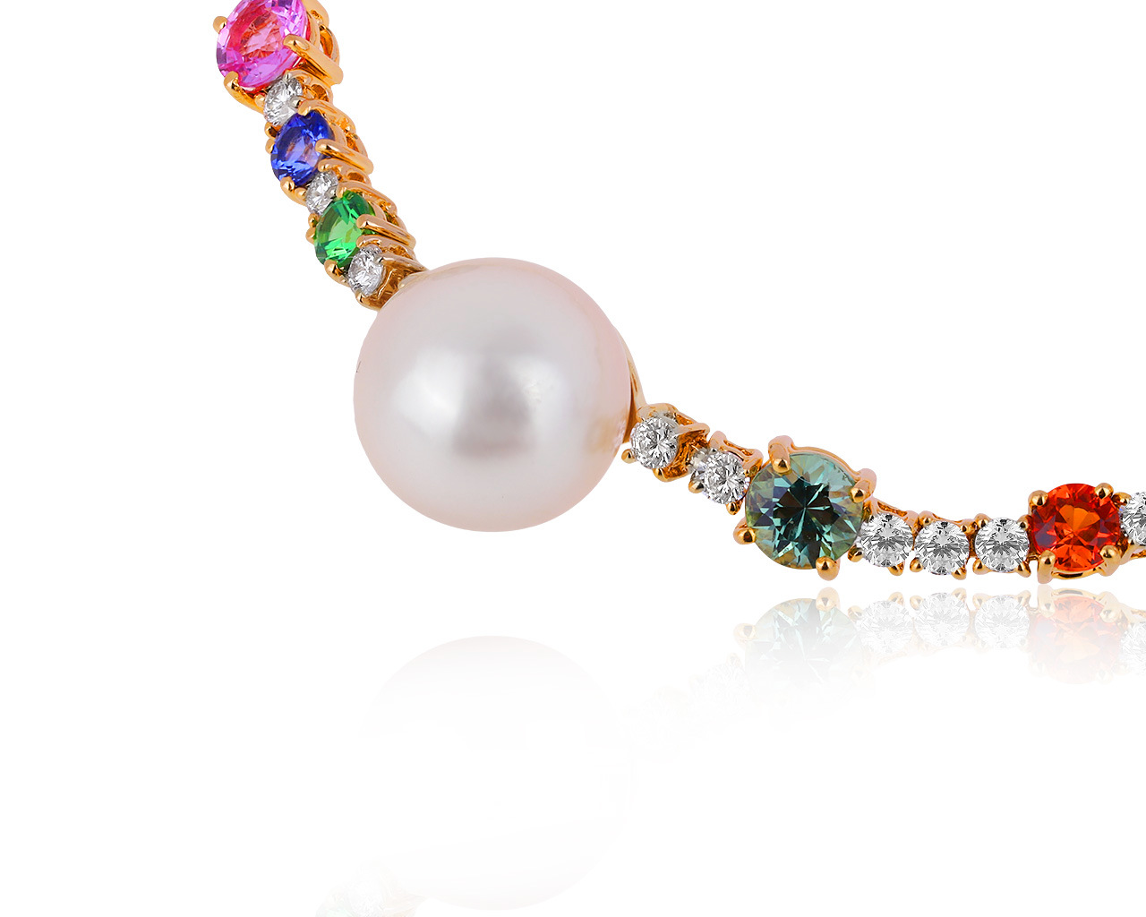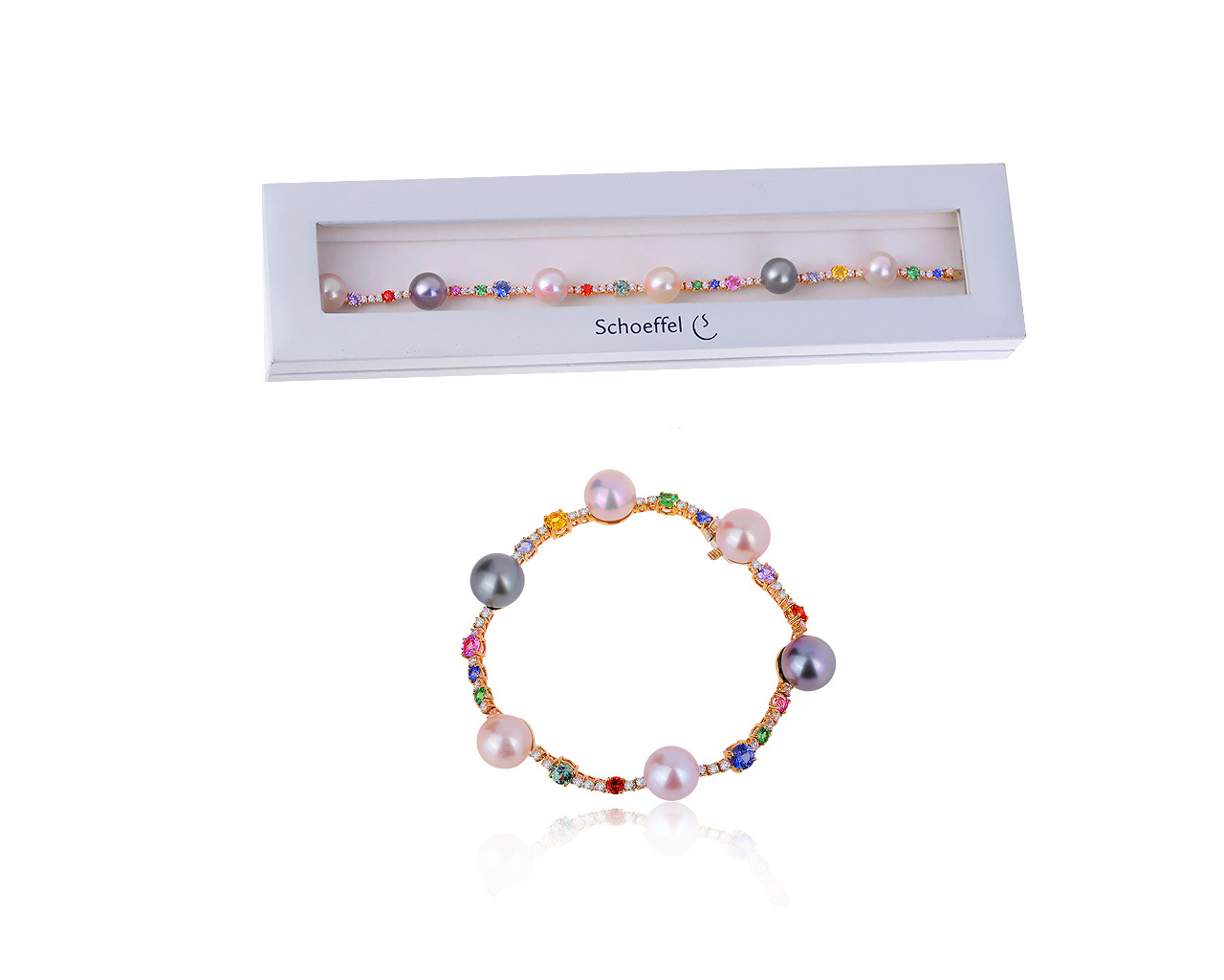 Представляем вашему вниманию оригинальный золотой браслет с жемчугом 10 мм, бриллиантами 1.33ct и голубыми 1.36ct и розовыми 0.76ct сапфирами от всемирно известного бренда Schoeffel.