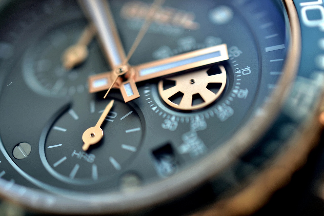 Заводная головка массивная, с винтовым присоединением к корпусу, кнопки хронографа крупные.