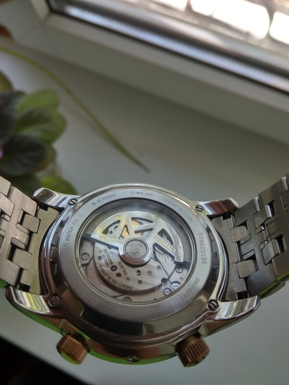 День, дата, месяц, день/ночь. Сапфировые стёкла с двух сторон.