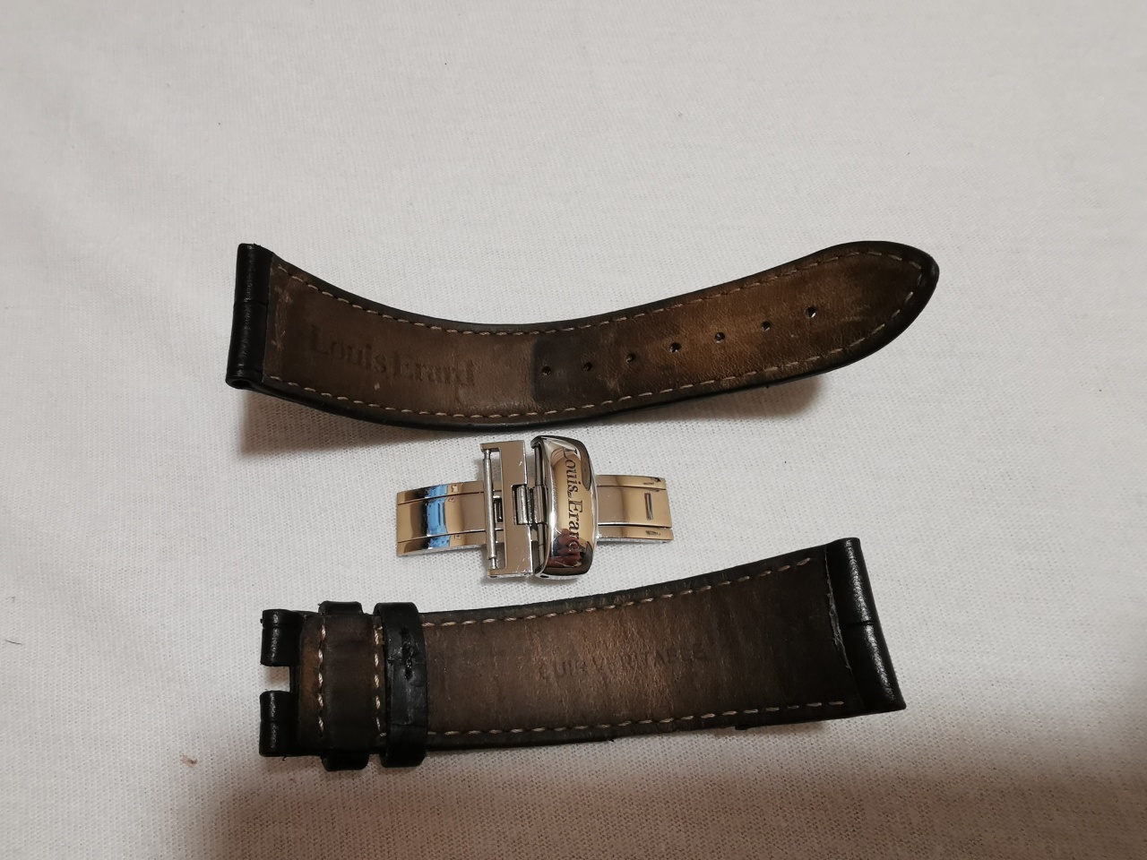Браслет: Кожа (есть родной ремень с застежкой (клипсой), кроме того прилагается хороший новый ремень HIRSCH DUKE)