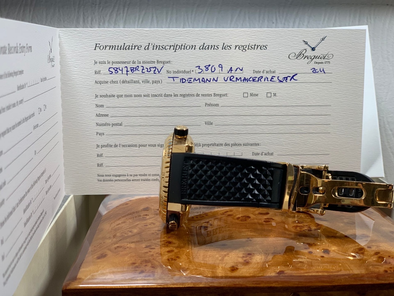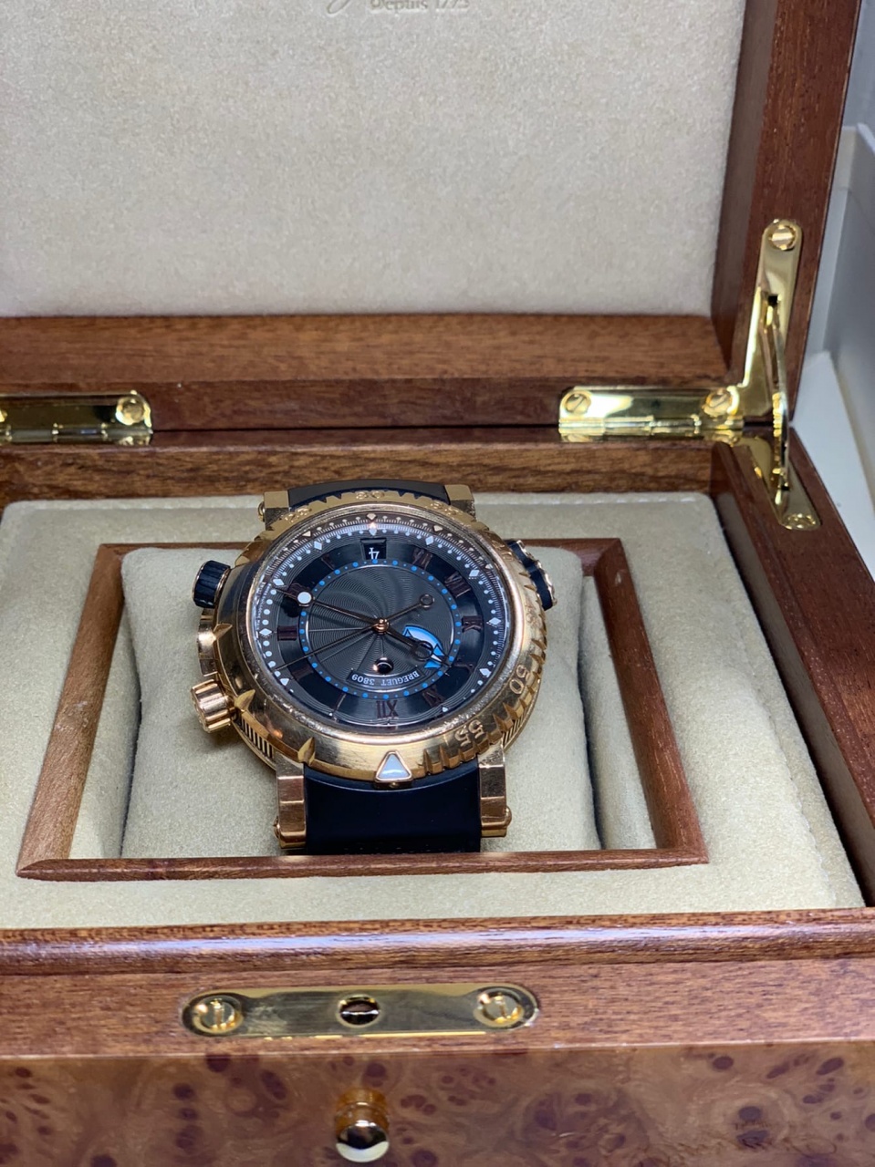 Представленные мужские часы, выполненные в спортивном стиле, превосходно сочетают в себе идеально созданный дизайн и современное техническое оснащение. Эта модель, разработанная фирмой Breguet, отличается своим напористым мужским характером. Модель поставляется в золотом корпусе размером 45 мм. Корпус часов толщиной 17,45 мм. Механизм с автоматическим подзаводом работает от амплитуды движения руки. Эти часы созданы специально для дайвинга, они могут выдерживать глубинное давление воды и обладают водонепроницаемостью в 300 м. Циферблат закрыт прозрачным антибликовым стеклом из сапфирового хрусталя высокой прочности, благодаря чему обеспечивается максимальная защита от сколов и механических повреждений. Для изготовления задней крышки корпуса часов также применяется сапфировое стекло, благодаря чему обеспечивается обзор на работу часового механизма. Часы укомплектованы каучуковым ремешком с раскладывающейся застежкой из золота, превосходно дополняющим эксклюзивный образ модели. Будильник. Запас хода до 45 часов. Задняя крышка прозрачная.