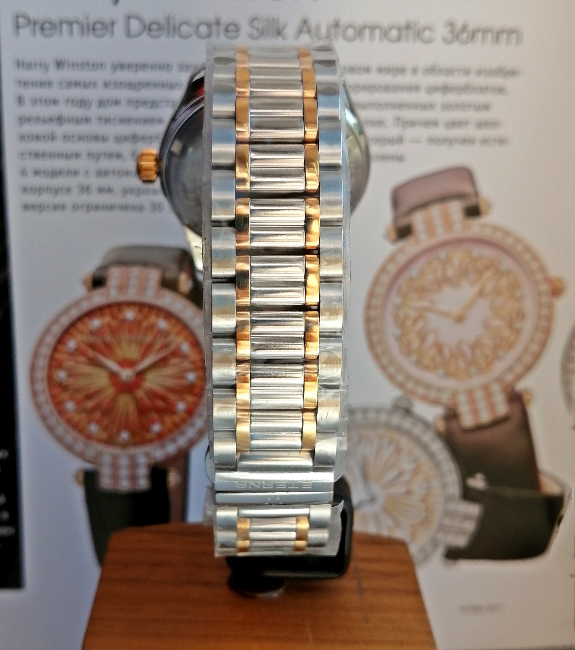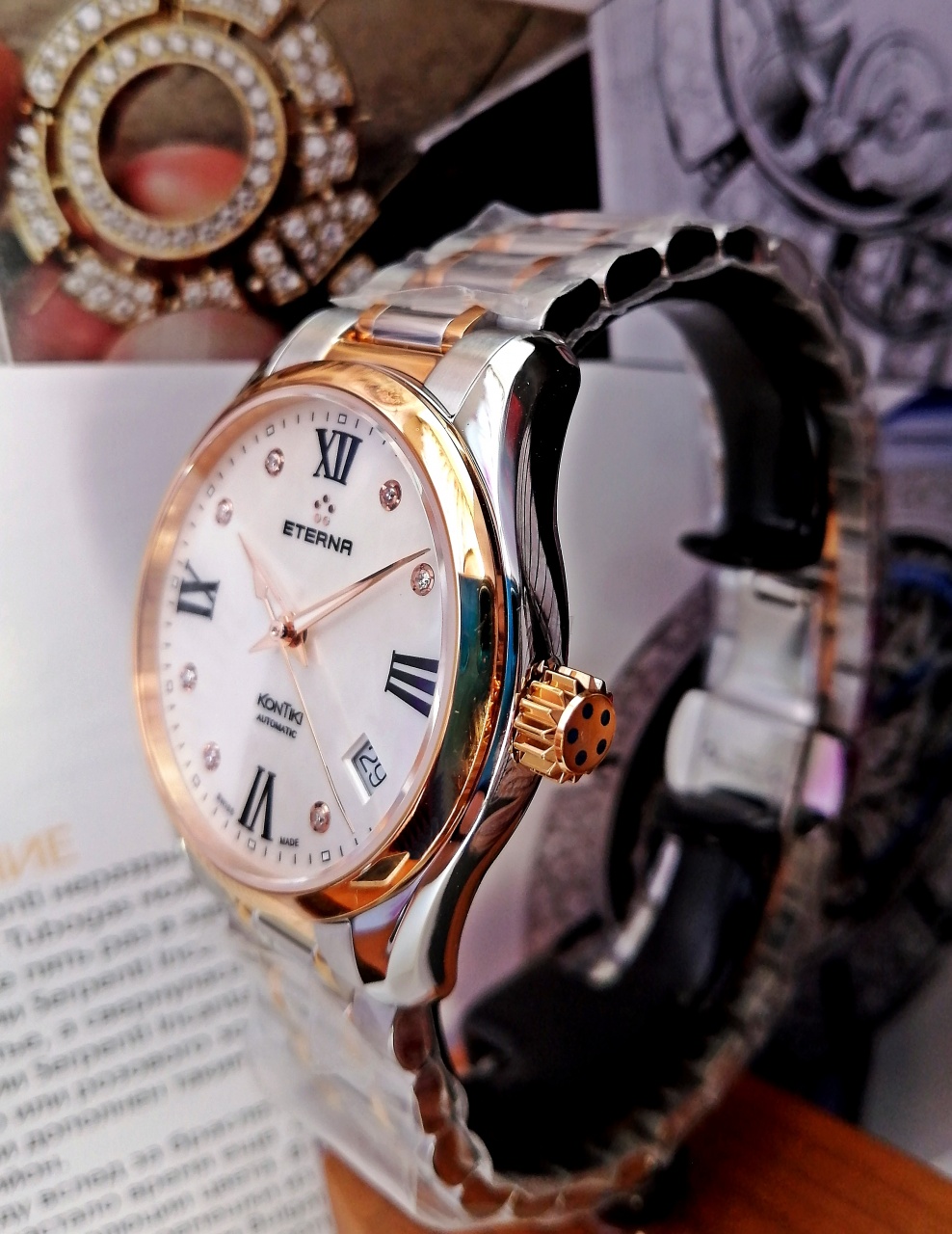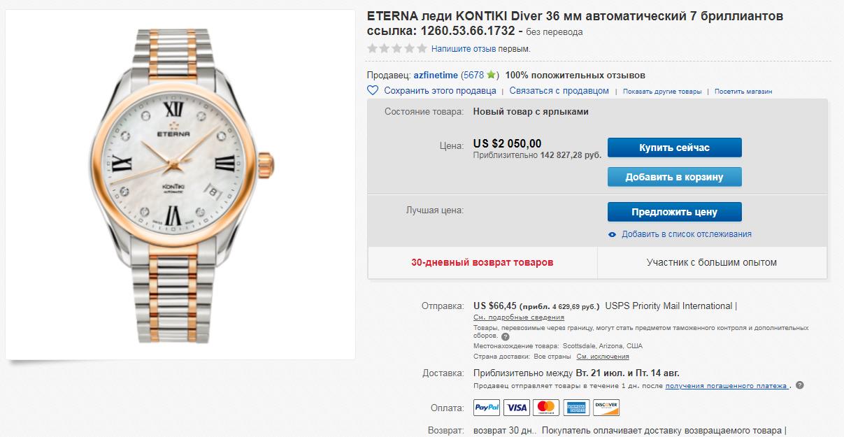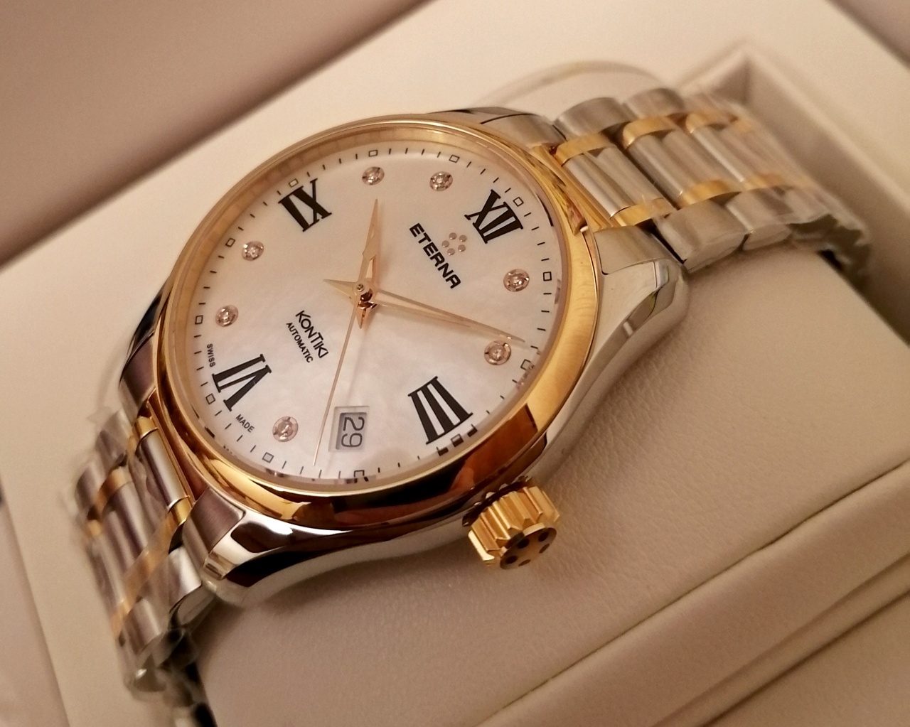 В продаже красивые женские часы от Eterna легендарной модели Kontiki в 36мм диаметре корпуса, автоматический швейцарский механизм, сапфировое стекло с антибликовым покрытием, 100м водозащита, завинчивающаяся ЗГ, биколорный литой браслет с раскладывающейся застёжкой, 7 бриллиантовых меток. Комплект, новые в плёнках, пересыл со страховкой в зоне действия офисов СДЭК в подарок.