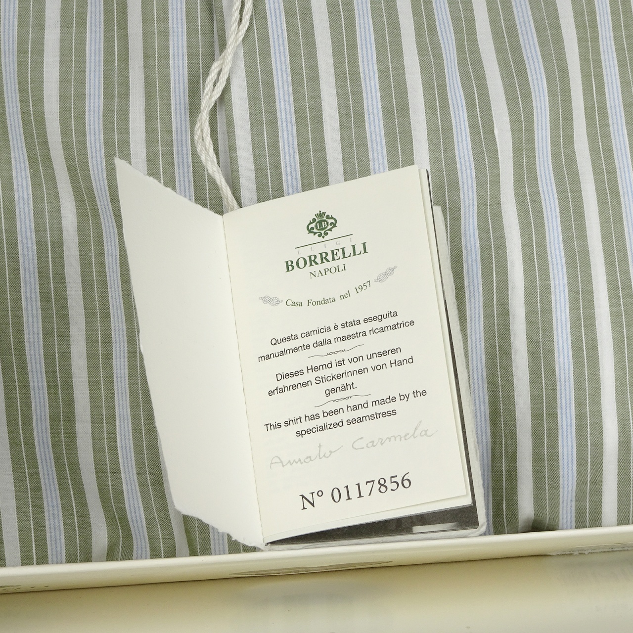 Каждая сорочка Luigi Borrelli получает свой индивидуальный серийный номер, а в комплект к рубашке идет книжечка-сертификат где вручную ставит свою подпись мастер-портной, который ее сшил.