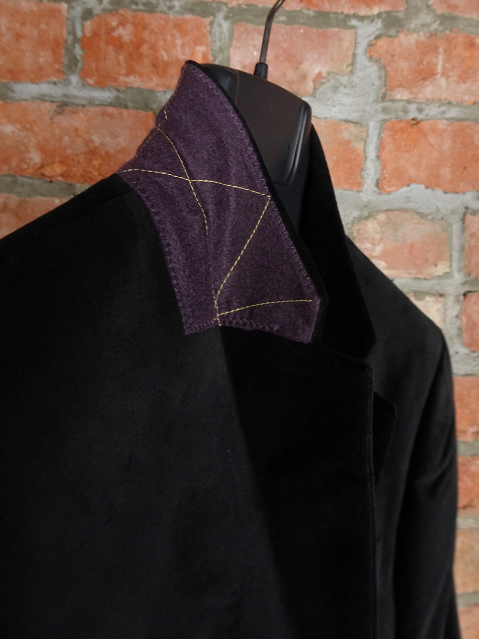 Подкладка - атласная ткань фиолетового и серого цвета. Отворот воротника с контрастной подкладкой фиолетового цвета с желтой прострочкой.