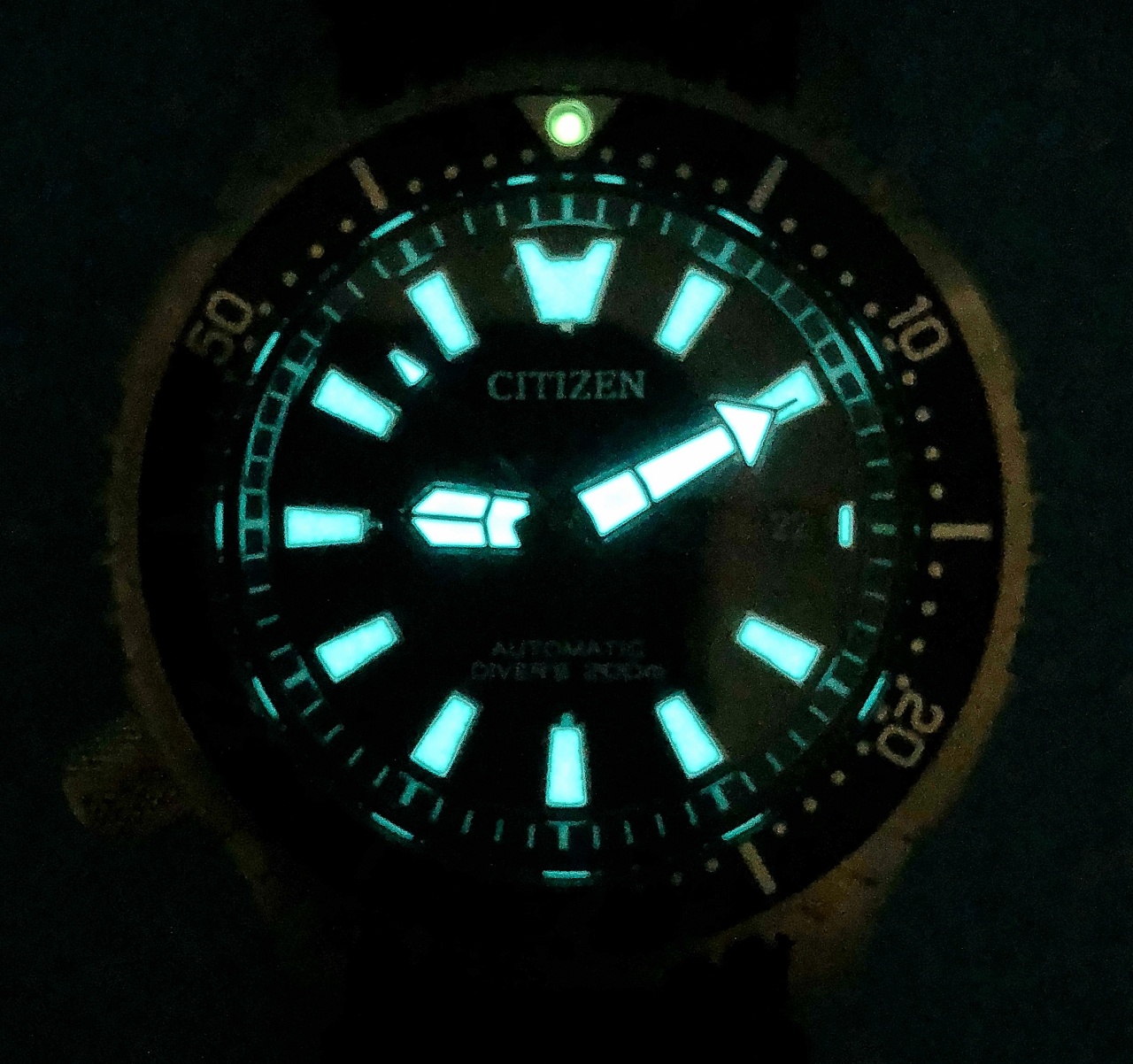 Голубой люм на стрелках и метках, зеленый на точке на безеле.