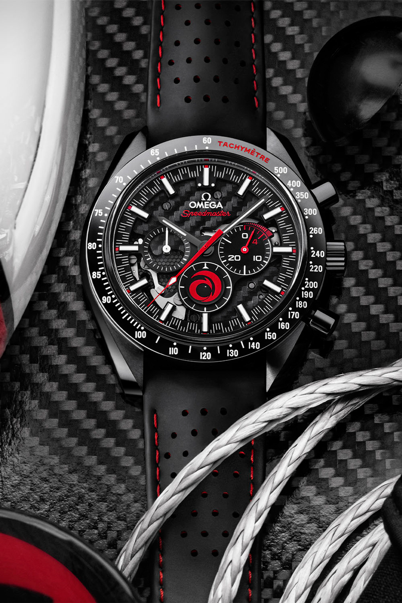 Особое внимание при создании новой модели уделено механизму. Калибр Omega 1865 с ручным заводом получил отделку, черпающую вдохновение в образе катамарана Alinghi TF35. Используя метод лазерной абляции, платина и мосты механизма покрыты карбоновой фактурой и «сотовым» орнаментом, схожим с отделкой интерьера углеродного корпуса лодки Alinghi. Калибр с рычажным спуском хронографа работает на частоте 3 Гц и обладает запасом хода 48 часов. Speedmaster Dark Side of the Moon Alinghi (ref. 311.92.44.30.01.002) предлагаются на черно-красном перфорированном каучуковом ремне с керамической баклей. Стоимость часов составит 10 000 швейцарских франков без учета налогов.