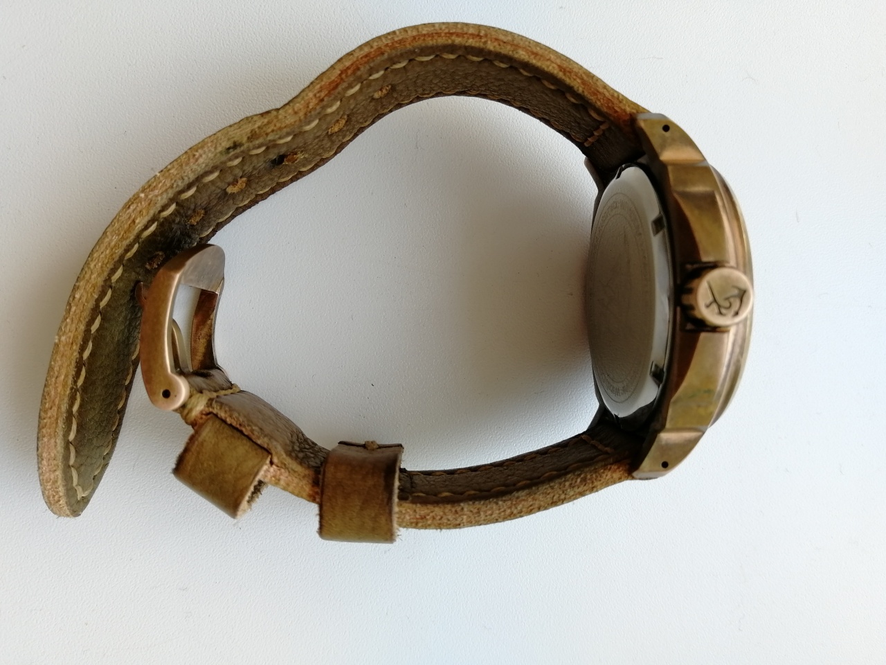 Вообще, на мой скромный взгляд, у данных часов самый красивый и яркий люм который я видел. Коробки и документов нет. В данный момент установлен черный ремешок с коричневой просточкой. Также в комплекте отдам 2 кожаных коричневых дорогих кастомных ремня с родными фирменными бронзовыми баклями. Один из подарочных ремней новый и совсем не носился, второй в отличном состоянии. В общем, отличный вариант для тех кто ищет бронзовые часы от хорошего производителя за разумную цену.