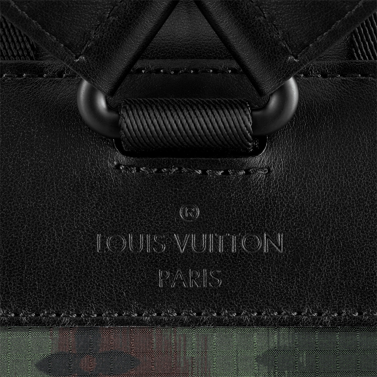 Материал - нейлон с узором LV Monogram Camo. Дополнен вставками из натуральной гладкой кожи черного цвета.