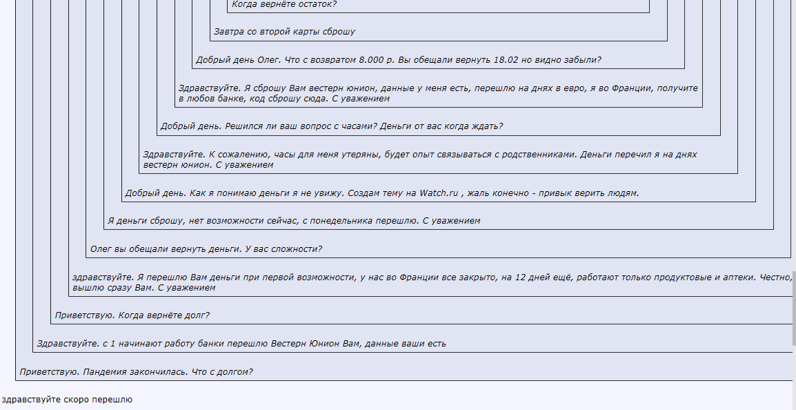 http://forum.watch.ru/showthread.php?t=530159. Связался с продавцом, обговорили сделку, предварительно посмотрел профиль участника (matvei2012) человек не вызывал опасения, выглядел довольно состоявшимся, судя по подписи в профиле (Алушта, Россия Профессиональная деятельность шеф-повар, МС СССР по стендовой стрельбе) вызывал доверие. Деньги я перевел за часы и стал ждать отправки. И далее начинается Мерлезонский балет. Мне сообщают что родственник которого попросили отправить мне часы исчез вместе с ними и найти его не удается. Мое мнение как и любого здравомыслящего человека, что все в жизни бывает (ВЕРНИТЕ ДЕНЬГИ). И тут самое интересное начинается. Matvei2012 возвращает мне на карту часть суммы а остальную просит подождать и дает свое честнейшее слово. Сумма не большая и я привык доверять людям. После этого человек оказывается резко в загранице и тут пандемия , банки не работают, и тд. но человек совестно обещает все вернуть. Все это длится уже четыре месяца, деньги он так и не вернул. Я не знаю как этот человек поступит но считаю что должен предупредить людей на форуме делайте выводы перед покупкой у этого форумчанина.
