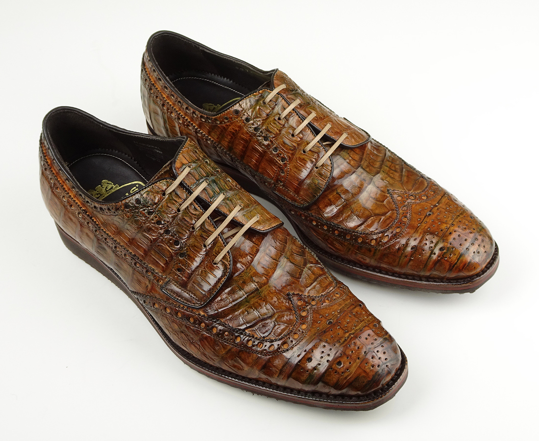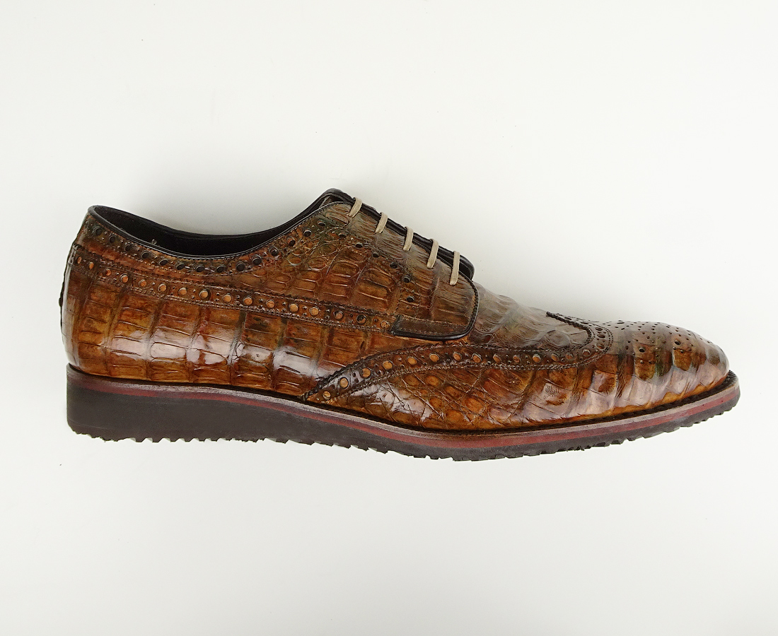 Материал: 100% натуральная кожа крокодила. Отлично подобранные рельефные участки кожи крокодила - более мягкие с боков на местах сгибов, и более выпуклые, фактурные, на мысах. Декорированы брогированием.