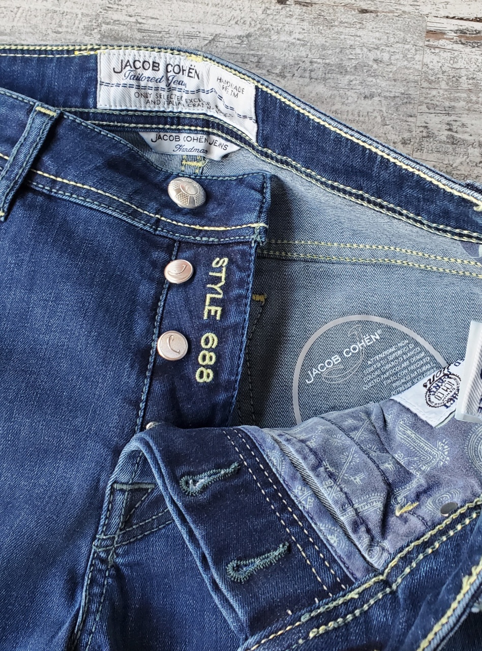 Модель: 688 LTD, прямого кроя, застёгиваются на фирменные пуговицы из серебра с логотипом Jасоb Соhеn.