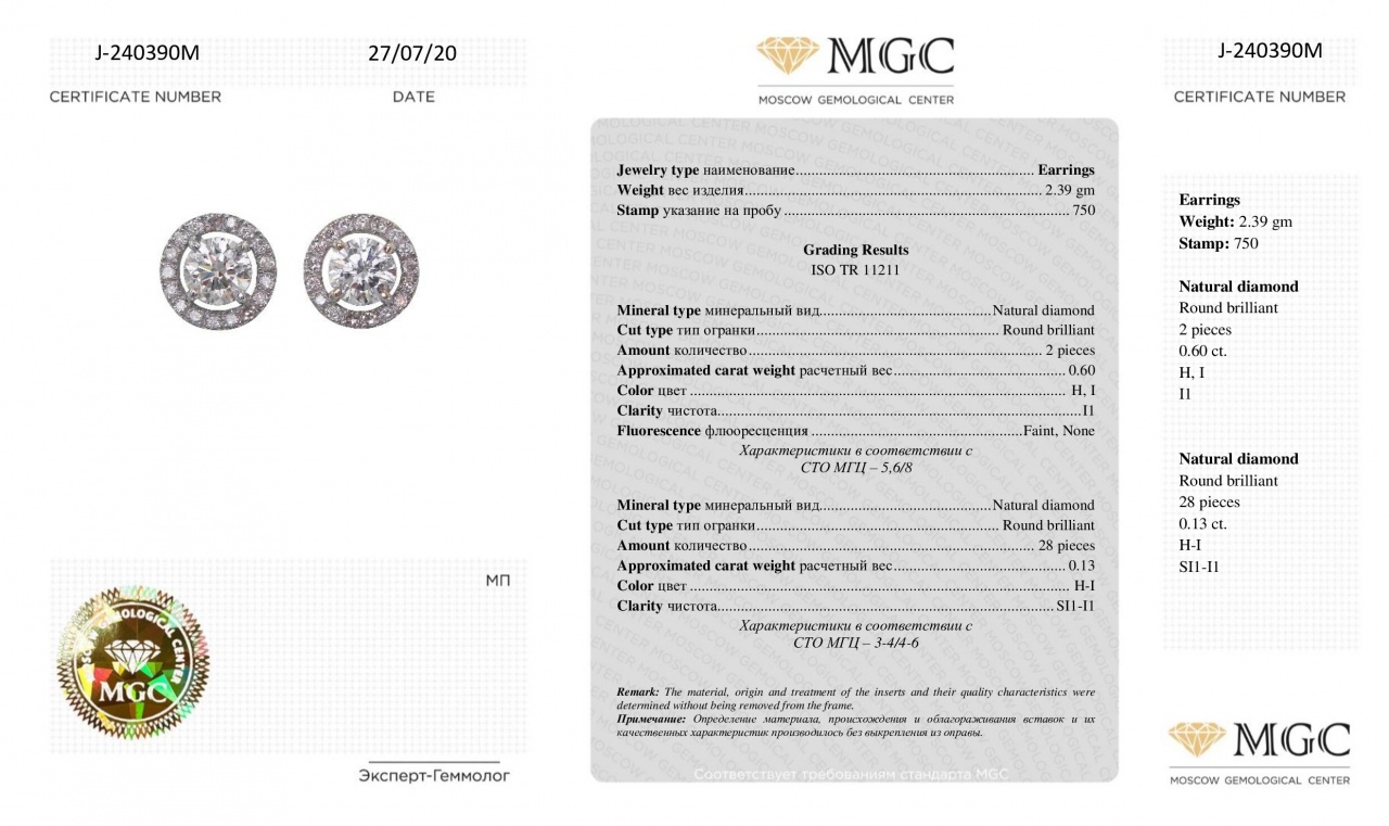 Серьги-пуссеты из белого золота с бриллиантами 0,73 карат (сертификат МГЦ)