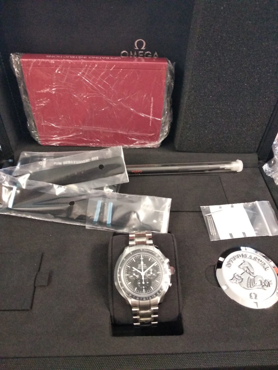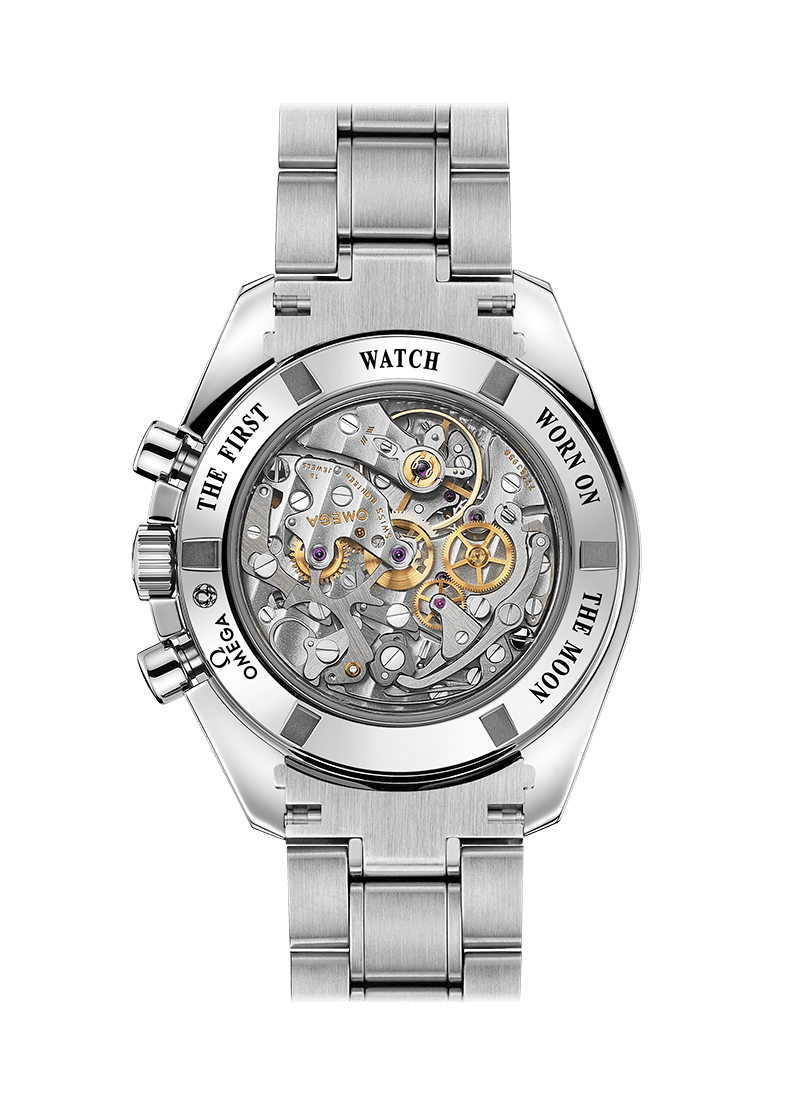 Хронограф оснащен механическим калибром OMEGA 1863 – потомко м знаменитого механизма с ручным заводом, который побывал на Луне. Часы предлагаются в подарочном футляре Moonwatch. В комплект входят сменный ремешок NATO, ремешок для астронавтов, инструмент для замены браслета и книга, рассказывающая о приключениях Speedmaster.