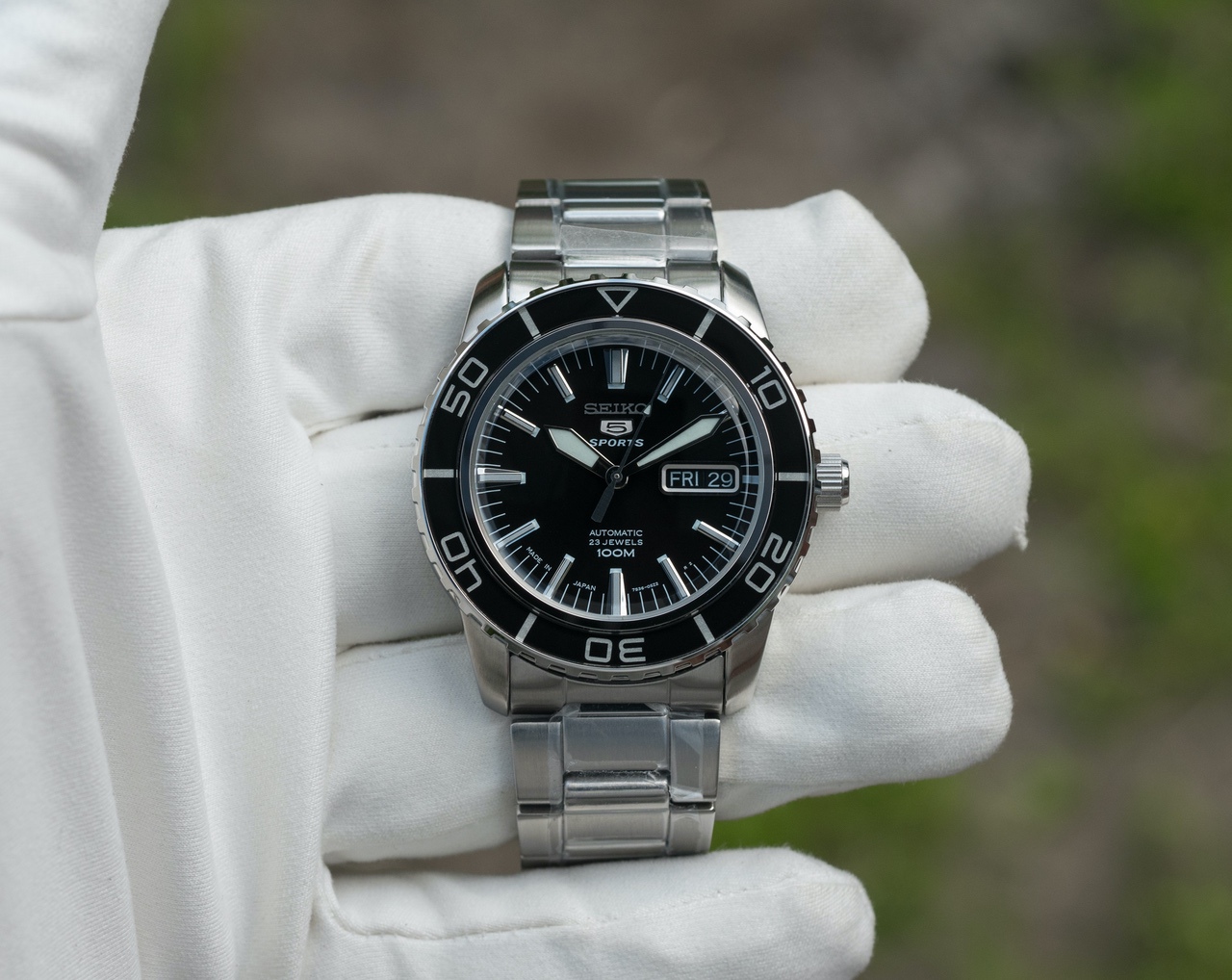 Черный циферблат, накладные метки, окантовка даты и лого Seiko 5