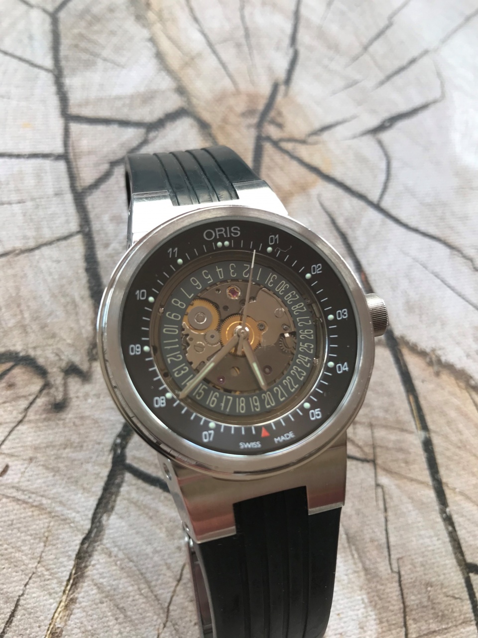 Калибр: ORIS 733, на базе SW 200. Запас хода: 38 ч. 28'800 A/ч, 4 Гц. На 26-ти камнях.