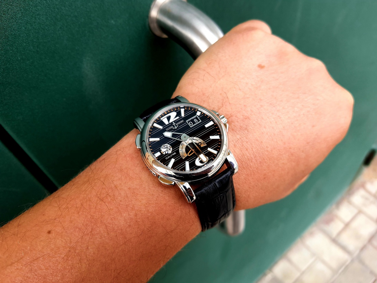 Одна из лучших в мире реализаций второго часового пояса, #GMT большая дата, с возможностью регулировки в обе стороны. Крайне необычная и интересная секундная стрелка, разбитый на 2 сегмента полукруг индикации.