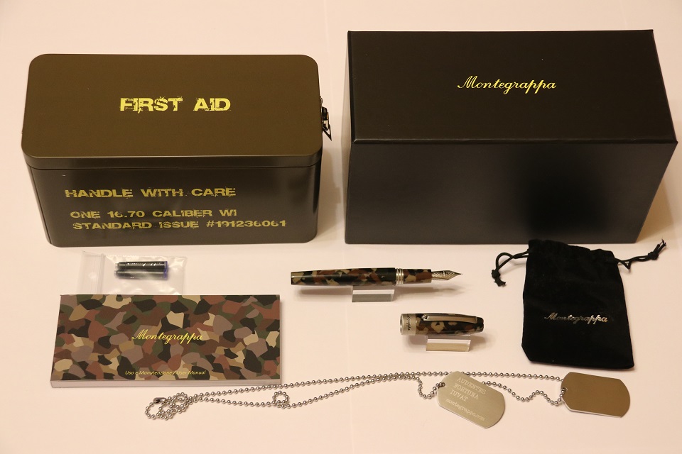 Комплект: ручка, коробка, шкатулка, конвертер для заправки чернилами из флакона/чернильницы, комплект картриджей, комплект документов, 2 металлических жетона dogtags на цепочке.