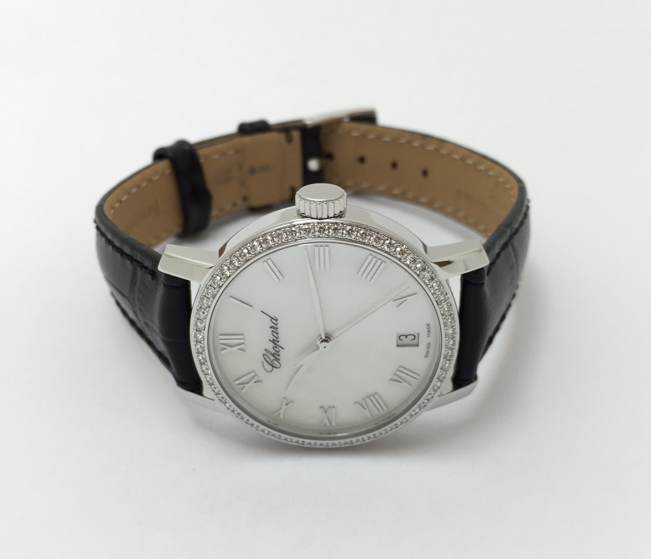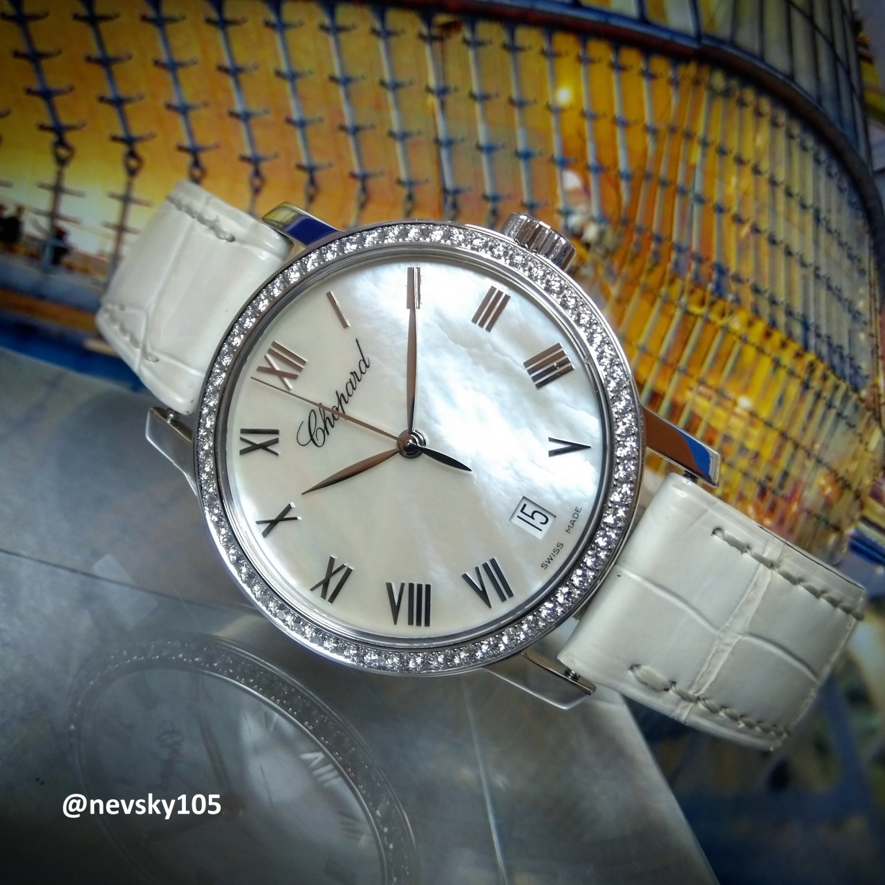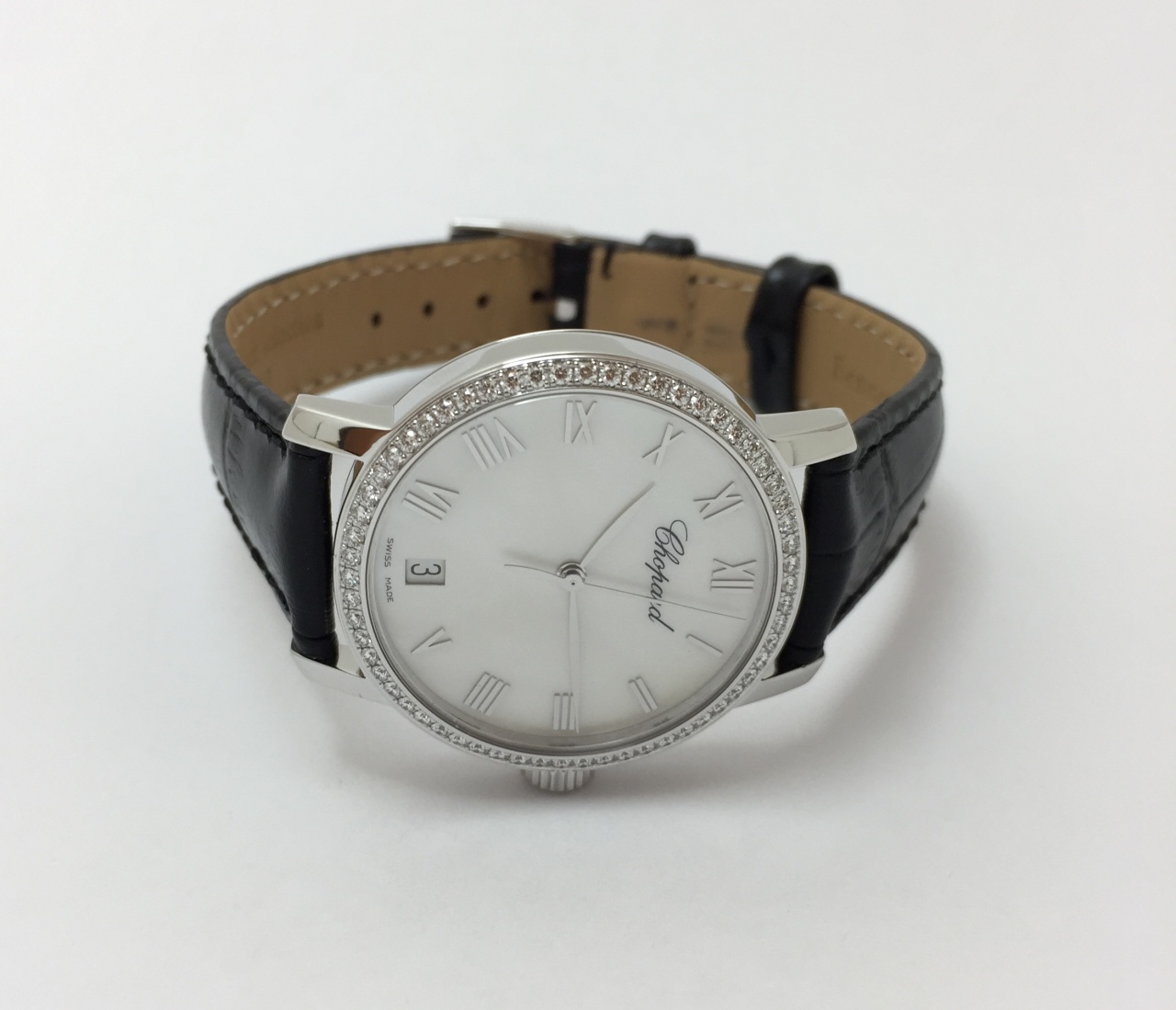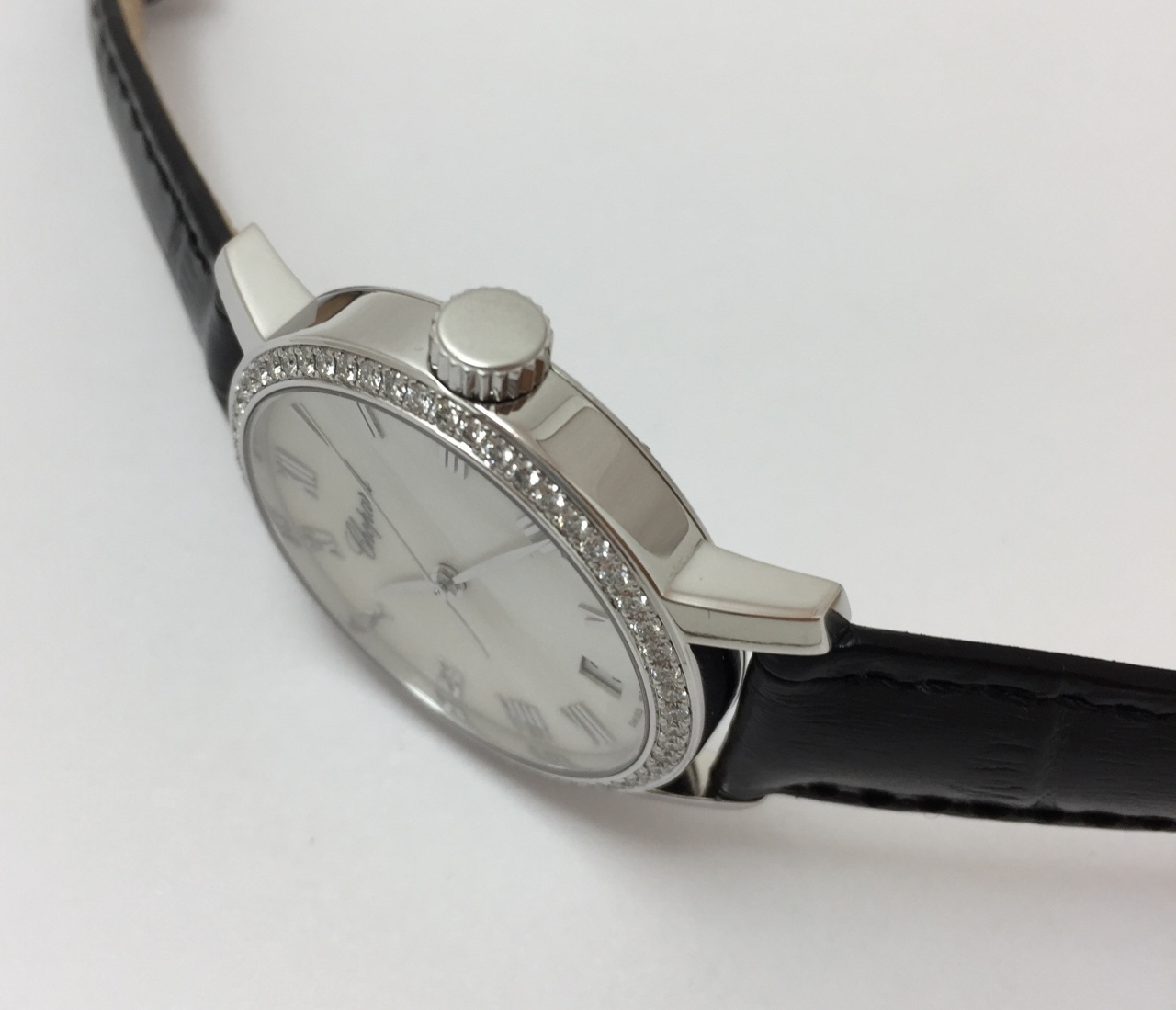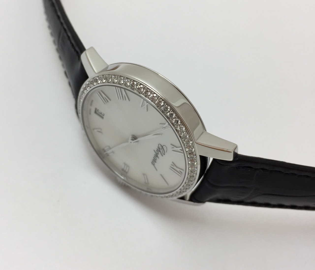 Корпус 33 мм, белое золото 750 пробы, бриллианты 0,84 карата, перламутровый циферблат, сапфировое стекло.