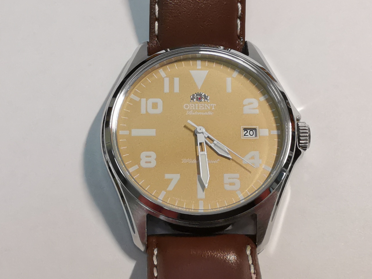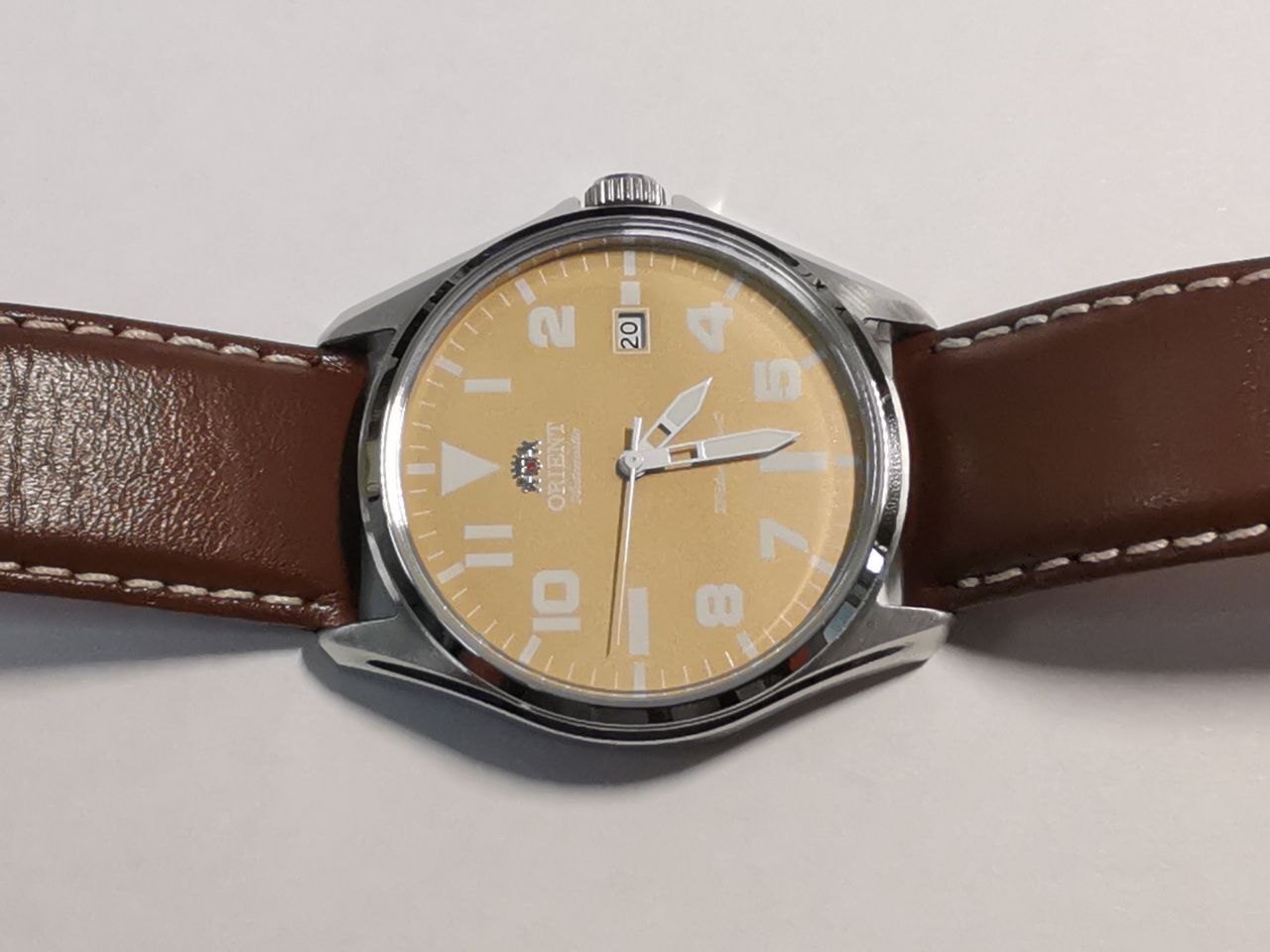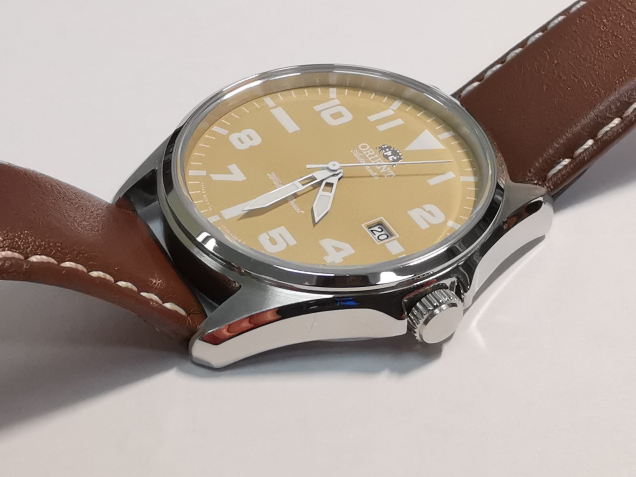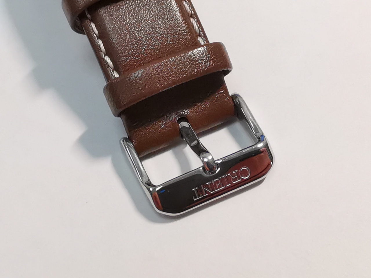 Ремешок шириной 22мм, выполнен из натуральной обработанной кожи. Ремешок имеет 2-3 технологических слоя, прошит белыми нитками. Бакля штампованная, из стали, полирована, имеет надпись Orient.