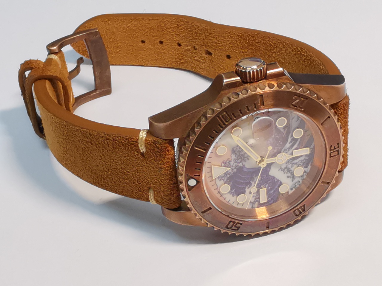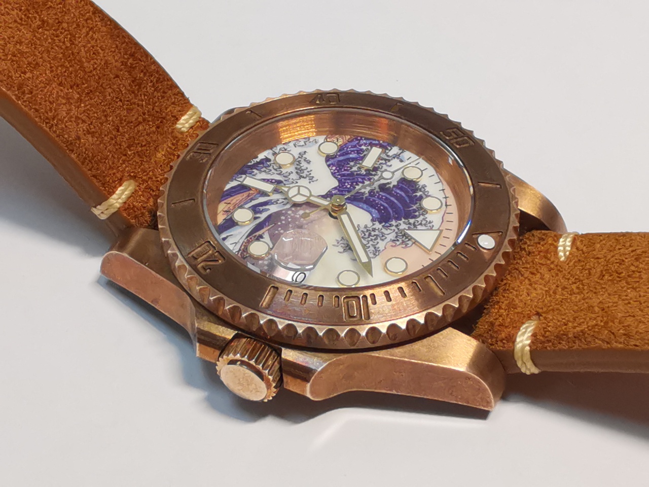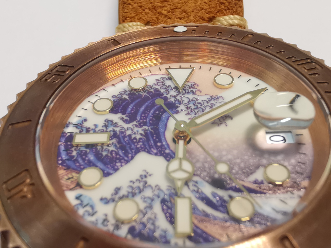 Циферблат художественный, выполнен мелко рельефной печатью с фрагментом гравюры Кацусика Хокусая "Великая волна в Канагава". Печать выполнена люминофорными красками, особенно видны в темноте светлые по гамме участки. По периметру окружности циферблата нанесены минутные метки черной краской в виде черточек. Часовые метки выполнены в виде кружков, двух прямоуголиков и треугольника заполненых средненьким(чуть ярче циферблата) по светимости люмом в золотой оправе. Окошко доты прямоугольное, без оформления. Стрелки в стиле "Мерседес" золотые с наполнением люмом той же силы, что и часовые метки.