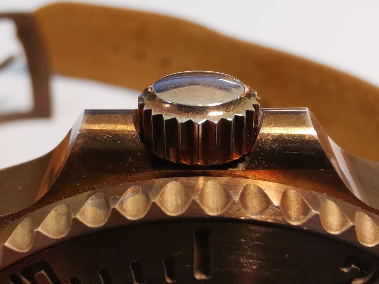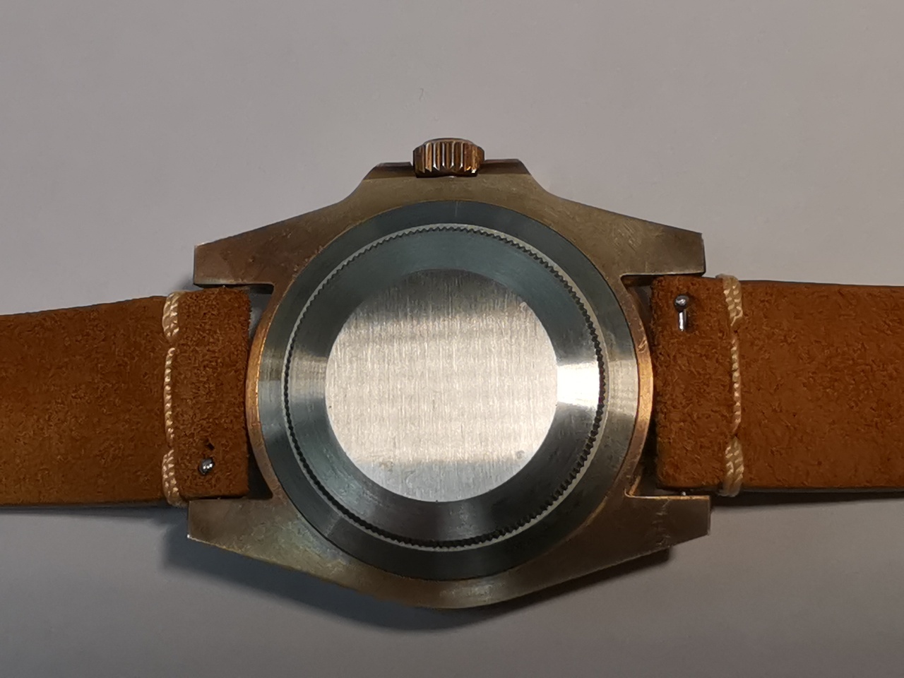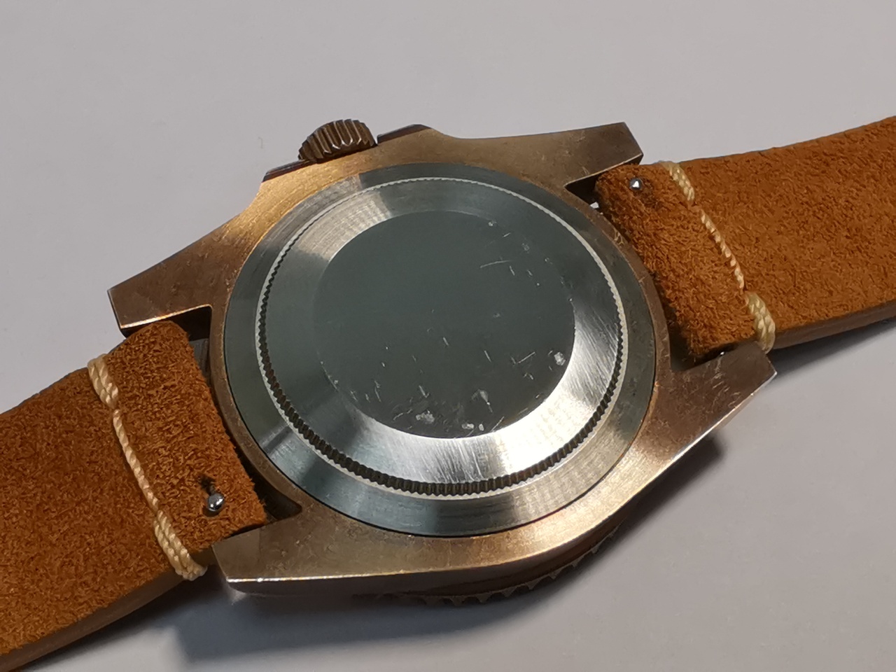 Корпус часов диаметром 40,5мм, выполнен из бронзы. От ушка до ушка 48мм, диаметр с головкой 44мм, между ушками 20мм. Толщина корпуса около 12мм(без циклопа). Корпус по всем поверхностям кроме верхней имеет следы чистовой механической обработки. Верхняя часть корпуса слегка браширована-сатинирована. Кромки довольно острые. Между ушками качество обработки металла как у Пагани.(заметные вертикальные полосы) Безель на 120 кликов выполнен из бронзы, имеет вставку с внутренней гравировкой в виде основных минутных обозначений и жемчужину с неплохим люмом в точке соответствующей 60 минутам. Вращение безеля туговатое но без усилий, люфта не имеет.