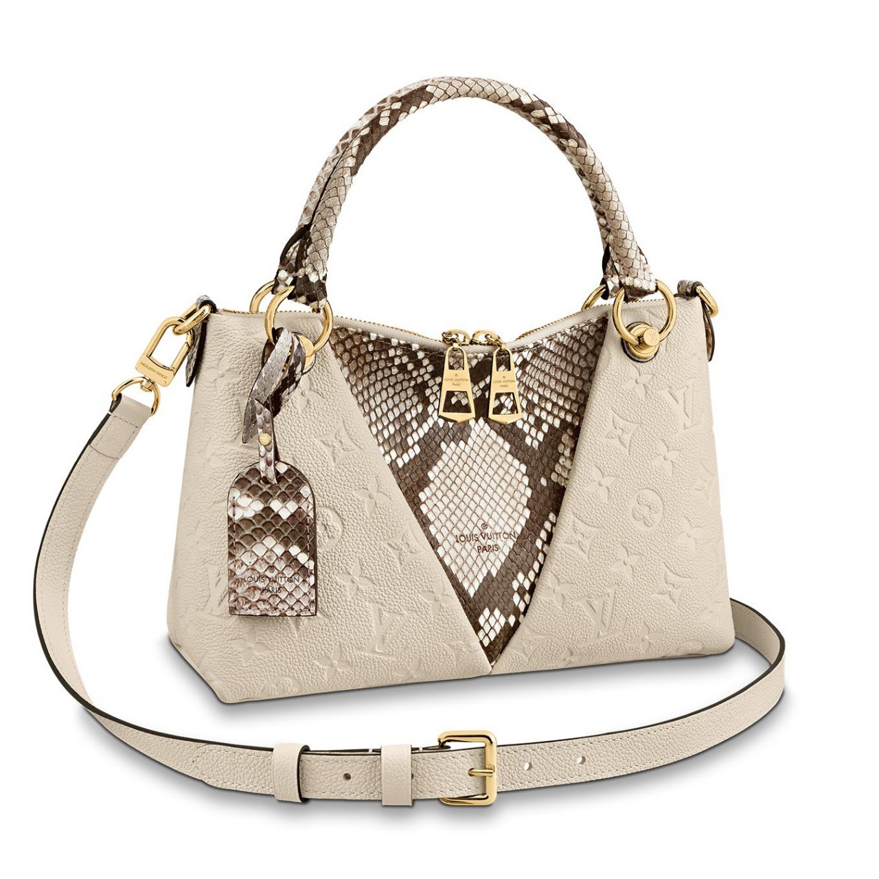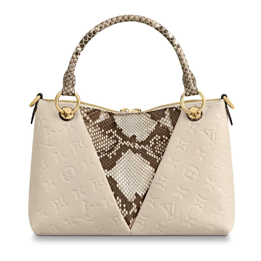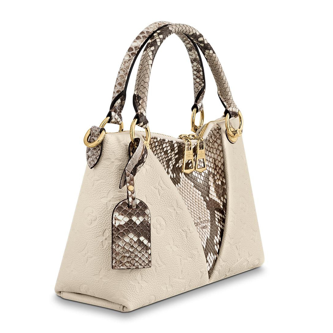 "Легендарный инициал V послужил основой дизайна сумки V Tote. Модная модель отличается уникальным треугольным элементом в форме буквы V, ставшим основой ее выразительного и современного дизайна. Сумка V Tote BB из капсульной коллекции 2020 выполнена в особо шикарной версии - из тиснёной кожи Monogram Empreinte и роскошной кожи питона. Мягкие нюансы окраса натурального питона и особого кремового бежевого цвета кожи Monogram Empreinte, подобранного с особым вкусом специально для этой коллекции, создают безупречный образ женственности и утонченности. Модель великолепно дополнит как дневной, так и вечерний образ. Двойные ручки Toron и съёмный плечевой ремень обеспечивают комфорт при ношении и придают универсальность. Сверкающая фурнитура золотистого цвета и багажная бирка в стиле традиционных чемоданов Дома Louis Vuitton завершают изысканный дизайн очаровательной модели размера BB".