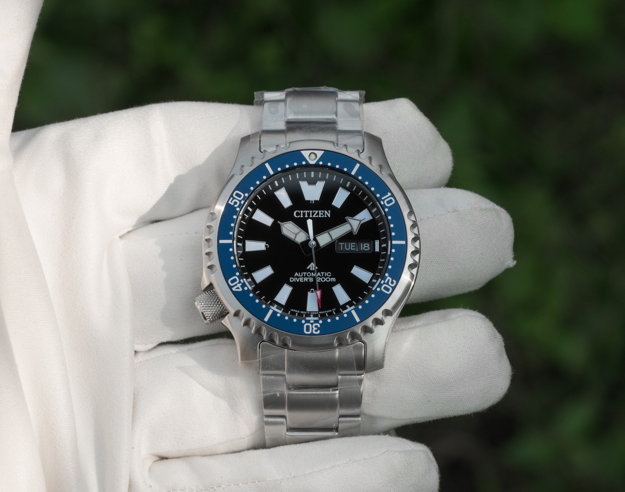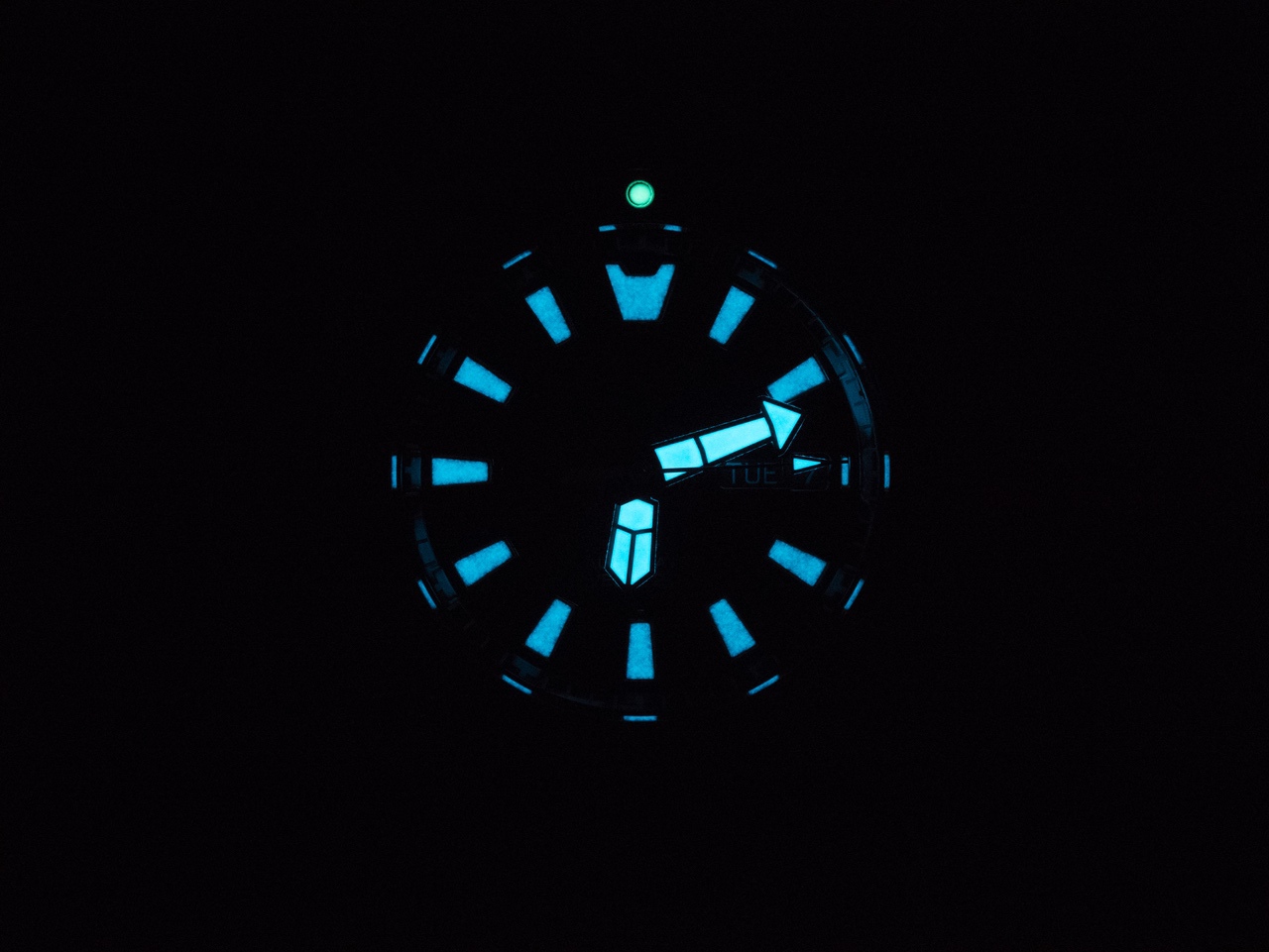 Голубой люм на стрелках и метках, зеленый на точке на безеле