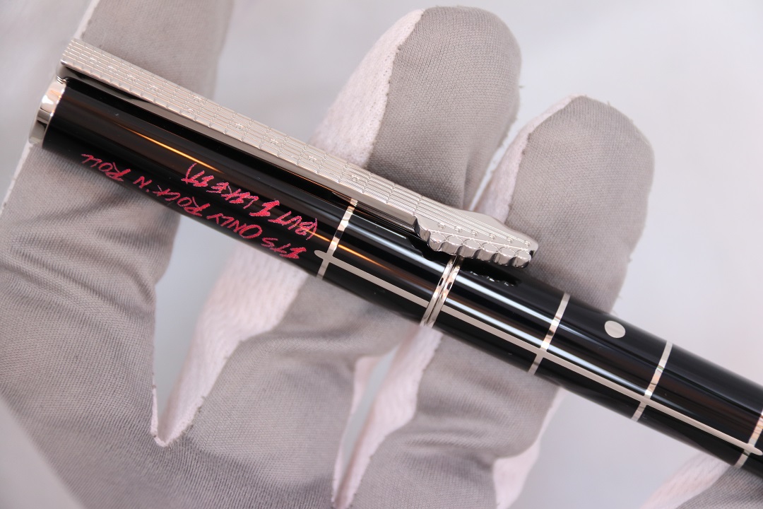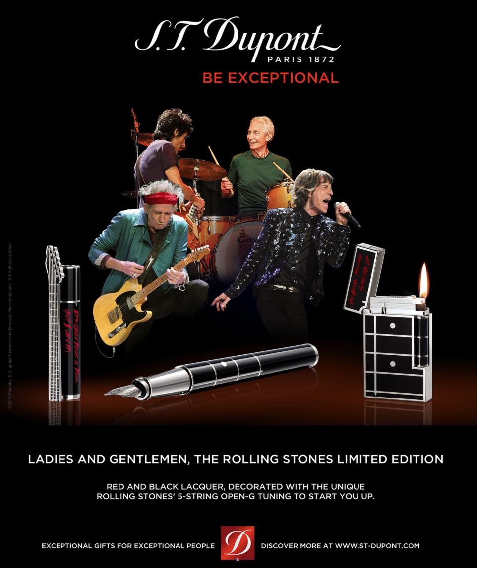 Дом S.T. Dupont отдает дань группе The Rolling Stones, представляя лимитированную серию ― настоящую 'симфонию' из черного лака и палладия, созданную ювелирами и мастерами-лакировщиками. Источником вдохновения для коллекции послужили тексты песен, особенно характерных для творчества The Rolling Stones. Зажим ручки Néo-Classique украшен утонченной гравировкой в виде знаменитой пятиструнной гитары Кита Ричардса, а на колпачке увековечены слова таких хитов, как 'Start me up', 'It's only Rock 'n' Roll (but I like it)', 'You got me rocking' или 'All down the line'.