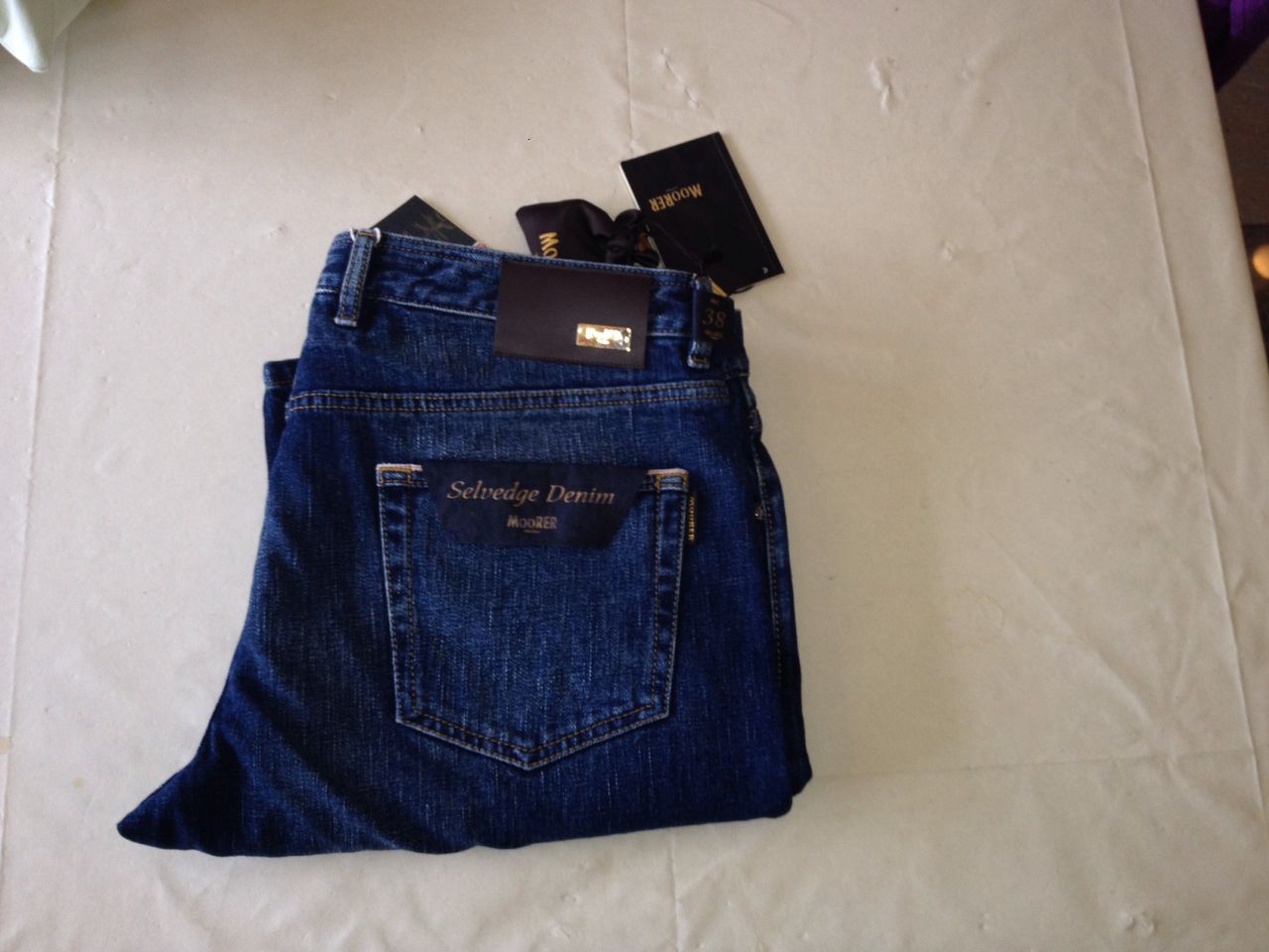 Продаются новые джинсы бренда де люкс MOORER превосходного исполнения, плотный японский Selvedge denim темно-синего цвета (окрас натуральным дорогим красителем ИНДИГО), модель TYPE 974 COMFORT, застегиваются на фирменные пуговицы с логотипом бренда, множество карманов, фирменный кожаный ярлык с логотипом бренда MOORER, состав: 98% хлопок, 2% эластан, все бирки и запасная фурнитура прилагаются, гарантированный оригинал, размер 40, производство Италия. Ретейл 785 евро.