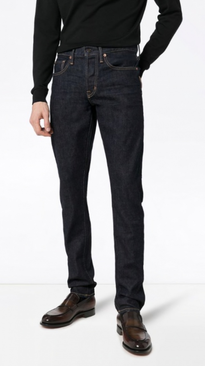 Для пошива джинсов Tom Ford выбрал особо прочный деним селвидж.Его изготавливают на старинных станках челночного типа,который может ткать только очень узкую полоску ткани(так,кромку не срезают и не обрабатывают оверлоком).