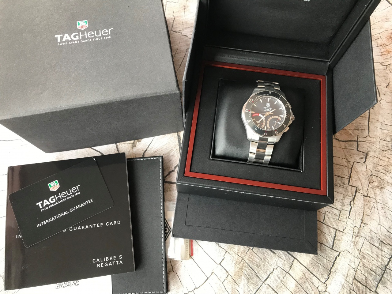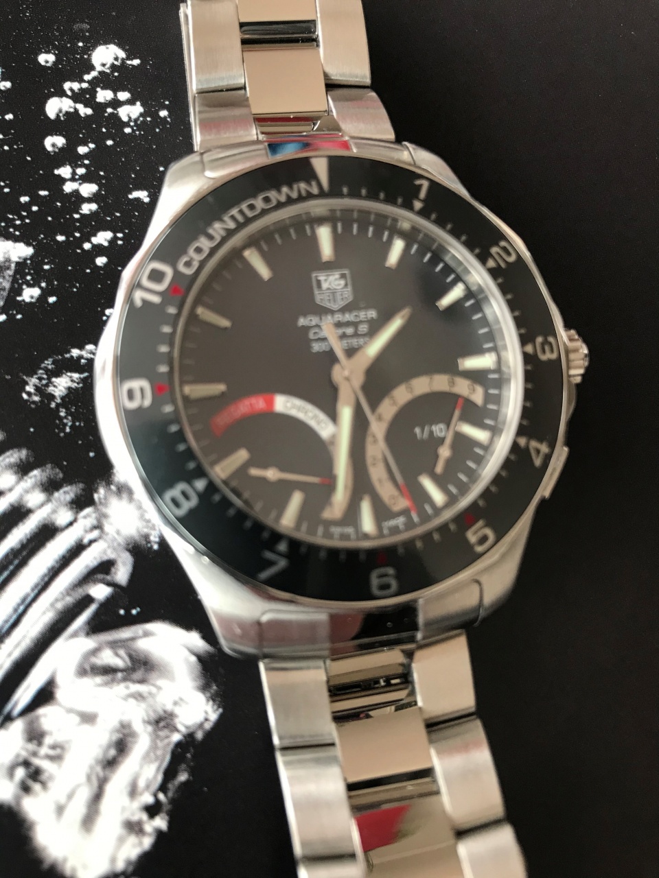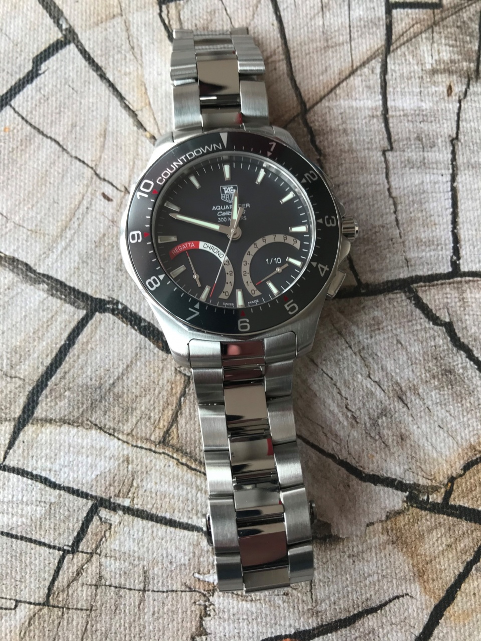 Aquaracer Calibre S Regatta - часы-хронограф с секундомером. Индикация времени и функций хронографа осуществляется с помощью центральных стрелок часов, минут и секунд. Разработанный и запатентованный TAG Heuer эксклюзивный механизм Calibre S, состоящий из 230 механических деталей и 5 двусторонних микромоторов Calibre S обладает уникальными функциями: интуитивная индикация значений хронографа с точностью до 1/10 секунды, измерение простых отрезков времени, промежуточных значений и двух отрезков времени с коротким интервалом между ними, ретроградный указатель даты с вечным календарем вплоть до 2099г., обратный отсчет для регат с возможностью регулировки от -10 до -1 мин, движение стрелок против часовой стрелки в режиме ''РЕГАТА'' с автоматическим включением хронографа по окончании обратного отсчета и началом движения стрелок по часовой стрелке. Переход из одного режима в другой осуществляется простым нажатием на заводную головку. Фиксированный безель со шкалой обратного отсчета (от -10 до -1 мин) для регат. Завинчивающаяся задняя крышка, обеспечивающая герметичность до глубины 300 метров. На задней крышке нанесен узор в виде аквалангиста.