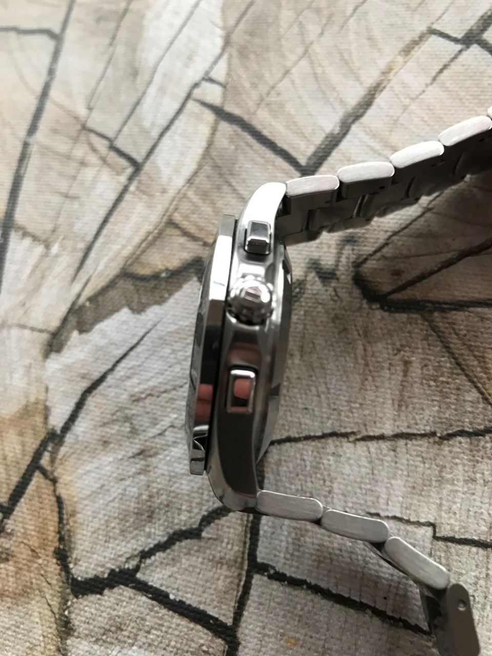 Шедевральный хронограф на мануфактурном механизме от гиганта часовой индустрии TAG Heuer. Состояние отличное, установлен новый оригинальный браслет (частично в пленках, есть доки), куплен у оф. представителей в Москве. Полный комплект: внешняя коробка, шкатулка, чехол, инструкция, гарантийная карта, доп.звенья.