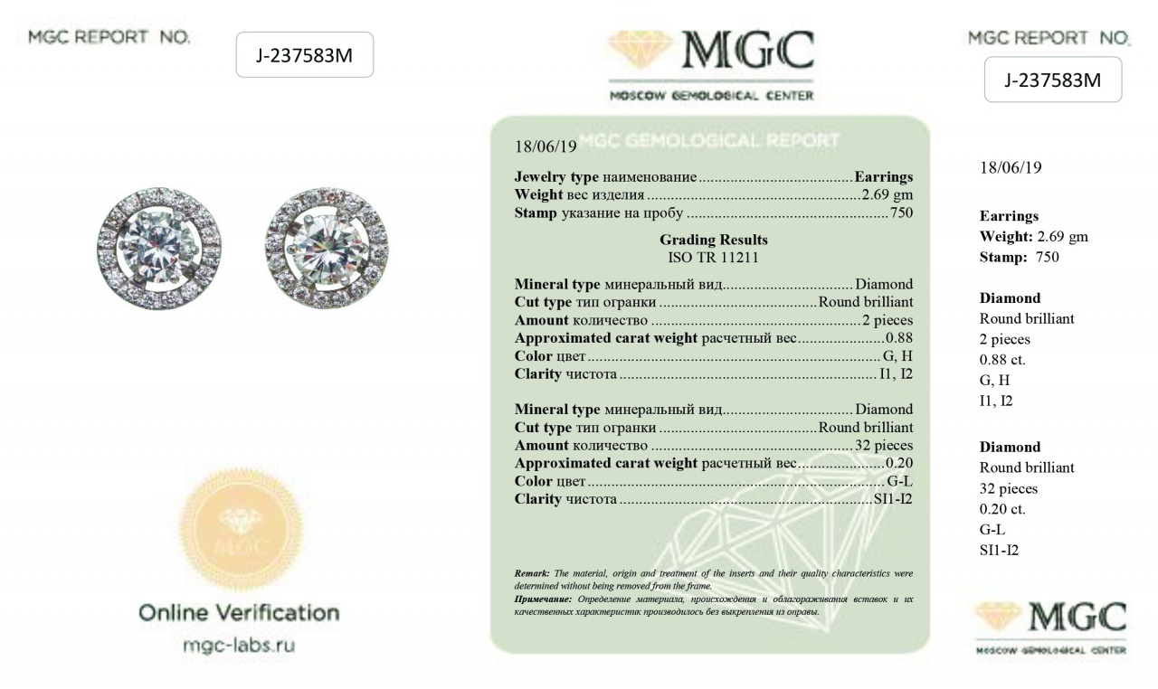 Серьги-пуссеты (трансформеры) из белого золота с бриллиантами 1,08 карат (сертификат МГЦ)