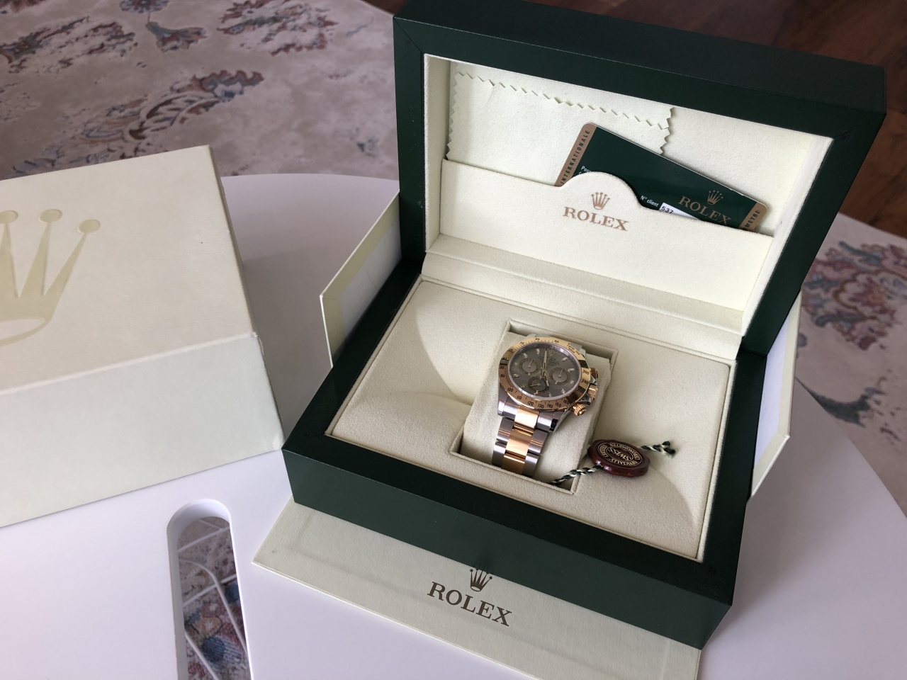 Часы в идеальном состоянии после нескольких носок предыдущим владельцем. Приобретены первым владельцем в ОАЭ в 2010 году. Были подарены настоящему владельцу в 2019. Настоящий владелец часы не носил. Первый владелец не снимал заводские пленки, но на момент публикации объявления они были удалены везде, кроме крышки, т.к. по краям пленок появились небольшие загрязнения мешающие презентабельно продемонстрировать часы. Из документов не хватает книжки