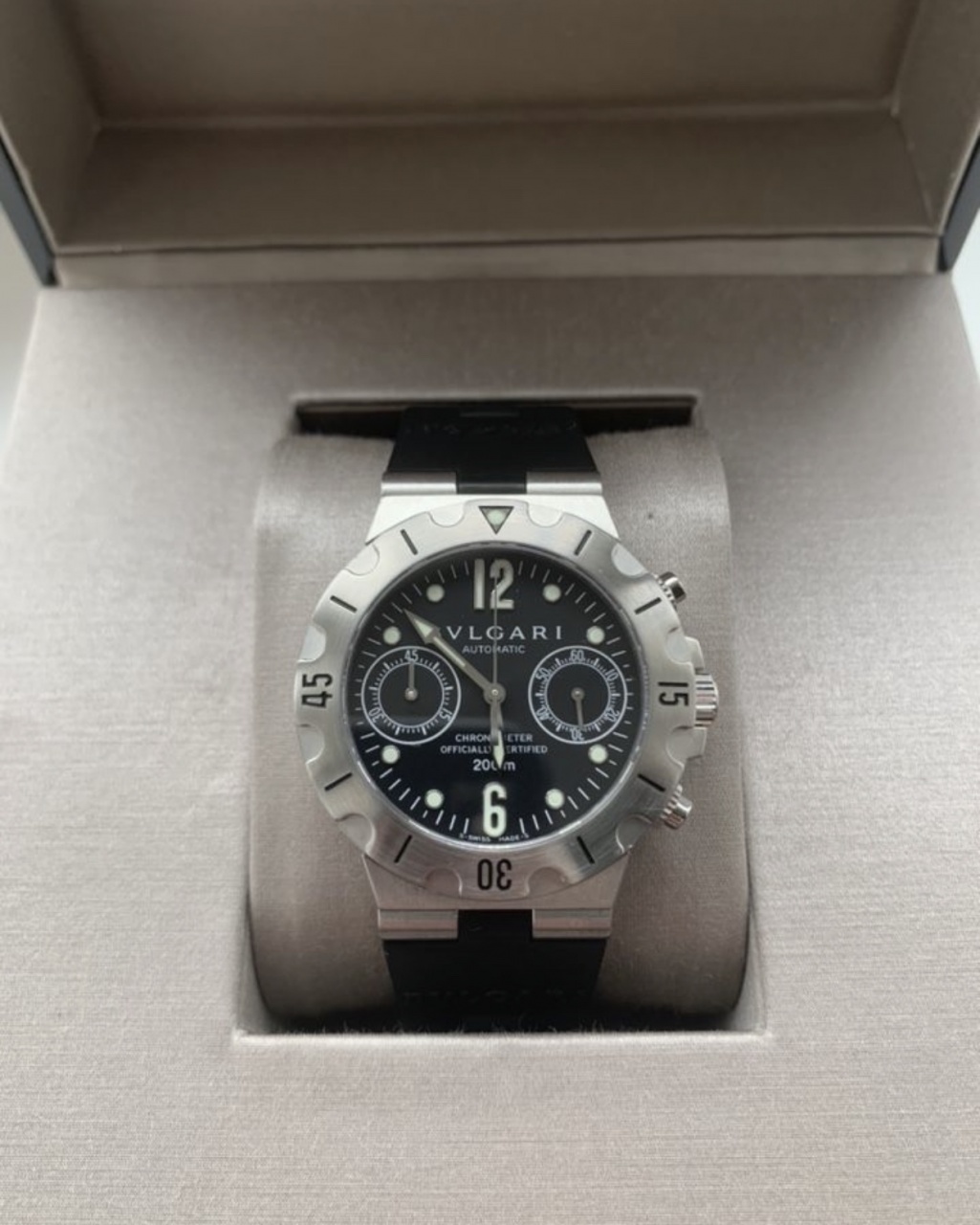Bvlgari Diagono Scuba референс SCB38S. Часы в отличном состоянии. Комплект включает в себя: часы, лакированную коробку, документы, гарантию, чек о покупке и оригинальный кожаный трэвел бокс.