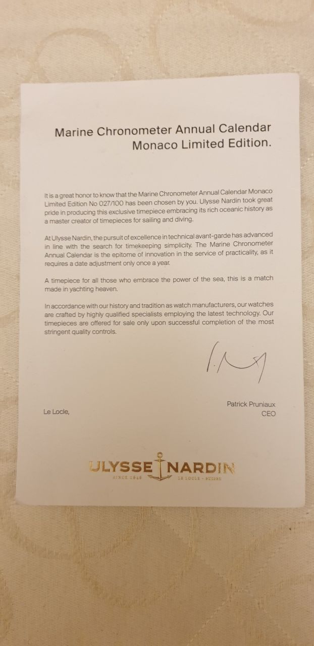 Куплены у официального дилера Ulysse Nardin в России. Дата покупки 6 мая 2020 года. Надевались один раз во время примерки в бутике, даже каучуковый ремень не подрезан.