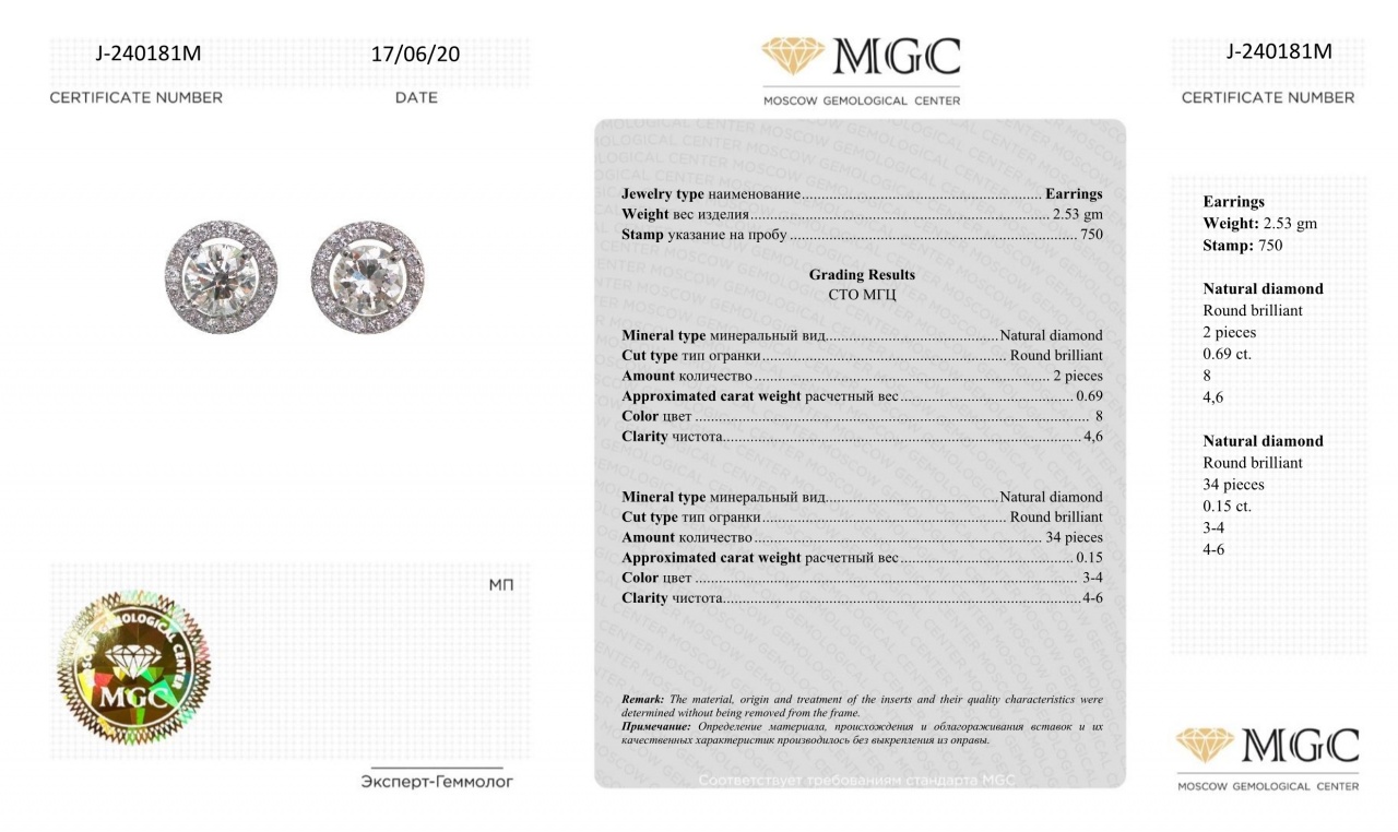 Серьги-пуссеты из белого золота с бриллиантами 0,84 карат (сертификат МГЦ)