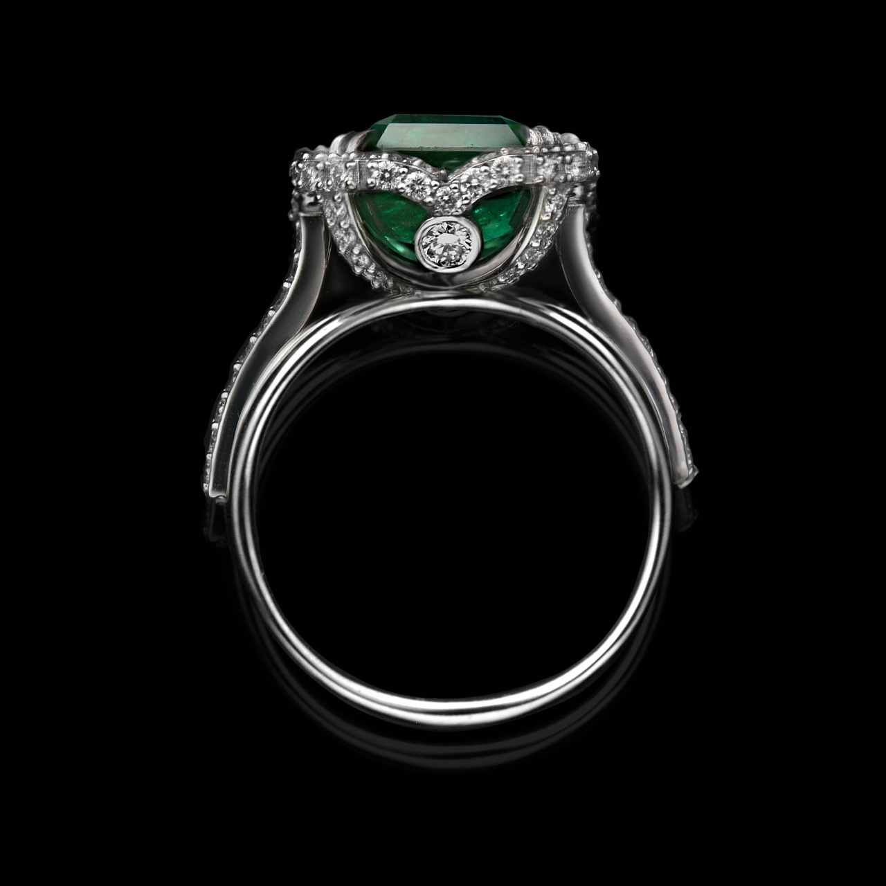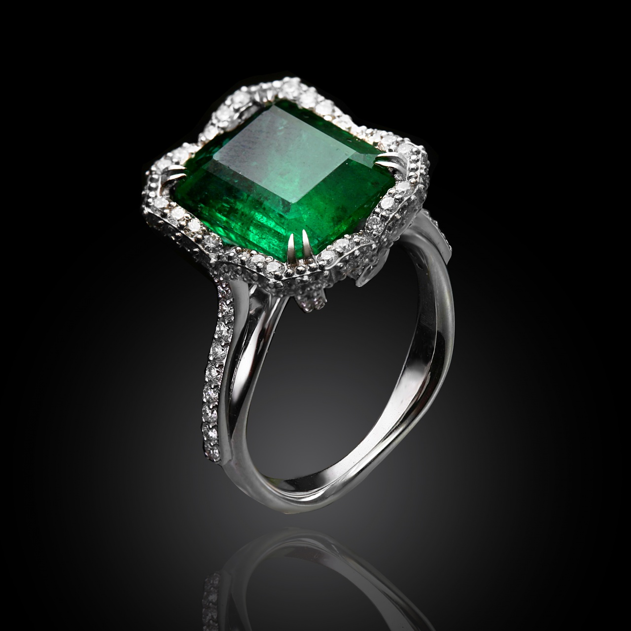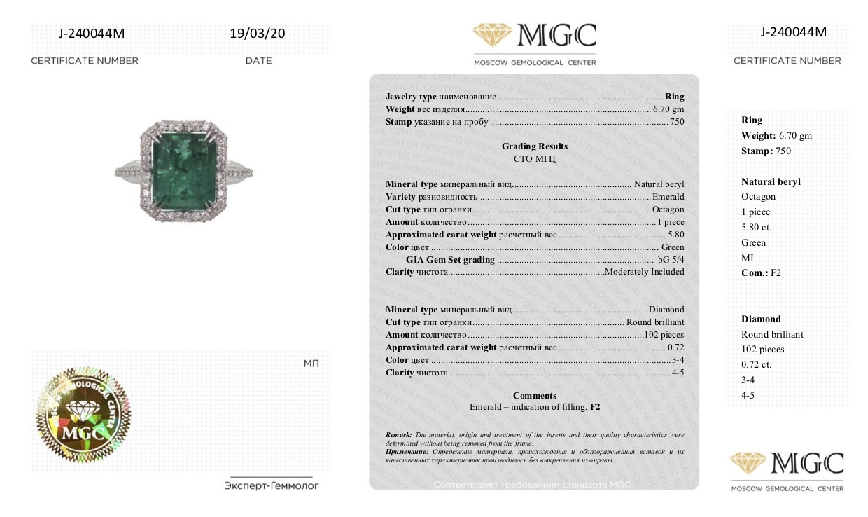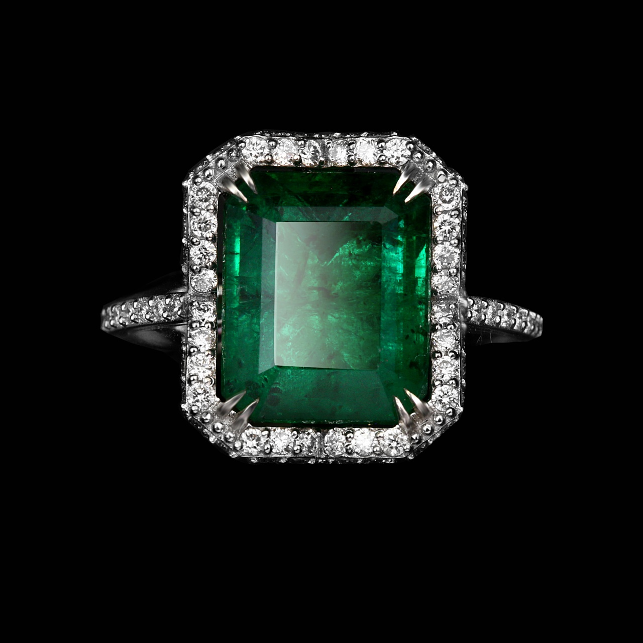 Кольцо из белого золота с изумрудом 5,8 карат и бриллиантами 0,72 карат (сертификат МГЦ)